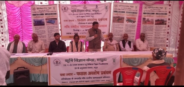 मथुरा। उत्तर प्रदेश पंडित दीनदयाल उपाध्याय पशु चिकित्सा विज्ञान विश्वविद्यालय एवं गौ अनुसंधान संस्थान मथुरा के अधीन संचालित कृषि विज्ञान केंद्र मथुरा द्वारा आज दिनांक 9 फरवरी 2024 को गांव आजनौख, विकासखंड छाता, जिला मथुरा में यथा स्थान फसल अवशेष प्रबंधन परियोजना के अंतर्गत ग्राम स्तरीय कृषक जागरूकता अभियान कार्यक्रम का आयोजन माननीय कुलपति प्रोफेसर ए.के. श्रीवास्तव, निदेशक प्रसार प्रोफेसर अतुल सक्सेना एवं कृषि विज्ञान केंद्र प्रभारी डॉक्टर वाई.के. शर्मा के दिशा निर्देशन में आयोजित किया गया कार्यक्रम में 100 से अधिक किसानों ने भाग लिया तथा खेती, किसानी, पशुपालन, बागवानी तथा पराली प्रबंधन के बारे में जानकारी दी गई । केंद्र के मृदा वैज्ञानिक डॉ रविंद्र कुमार राजपूत द्वारा किसानों को पराली प्रबंधन के विषय में बताया तथा पराली प्रबंधन के लिए सुपर सीडर, रोटावेटर, मल्चर, चोपर, रिवर्सिबल एम.बी. प्लाऊ, सुपर एसएमएस, रोटावेटर, बेलर, रैक आदि सभी मशीनों के बारे में जानकारी दी तथा मशीनों पर कितना-कितना अनुदान देय है आदि के विषय में भी किसानों को बताया साथ ही साथ मृदा परीक्षण, जल परीक्षण एवं पोषक तत्व प्रबंधन व जैविक खेती के बारे में भी किसानों को जानकारी दी गयीं। कृषि विभाग के प्राविधिक सहायक नरेंद्र सिंह फौजदार ने विभाग  द्वारा चलाई जा रही कृषि कल्याण की योजनाओं के बारे में किसानों को जानकारी दी जिसमें सोलर पम्प योजना, सम्मान निधि योजना, बीज योजना व मशीनों एवं कृषि यंत्रों पर देने वाले अनुदान के विषय में भी जानकारी दी । परियोजना के फार्मर चेंज एजेंट जितेंद्र सिंह द्वारा किसानों को परियोजना के बारे में जानकारी दी। गांव के श्री मोहरपाल सिंह, शिवचरण, नरेश कुमार, किशन सिंह, देवेंद्र, हरिश्चंद्र, विजेंद्र सिंह, मीरा, बसंती, बृजबाला, हेमाष माया आदि 100 से अधिक किसानों ने जागरूकता कार्यक्रम में भाग लिया।