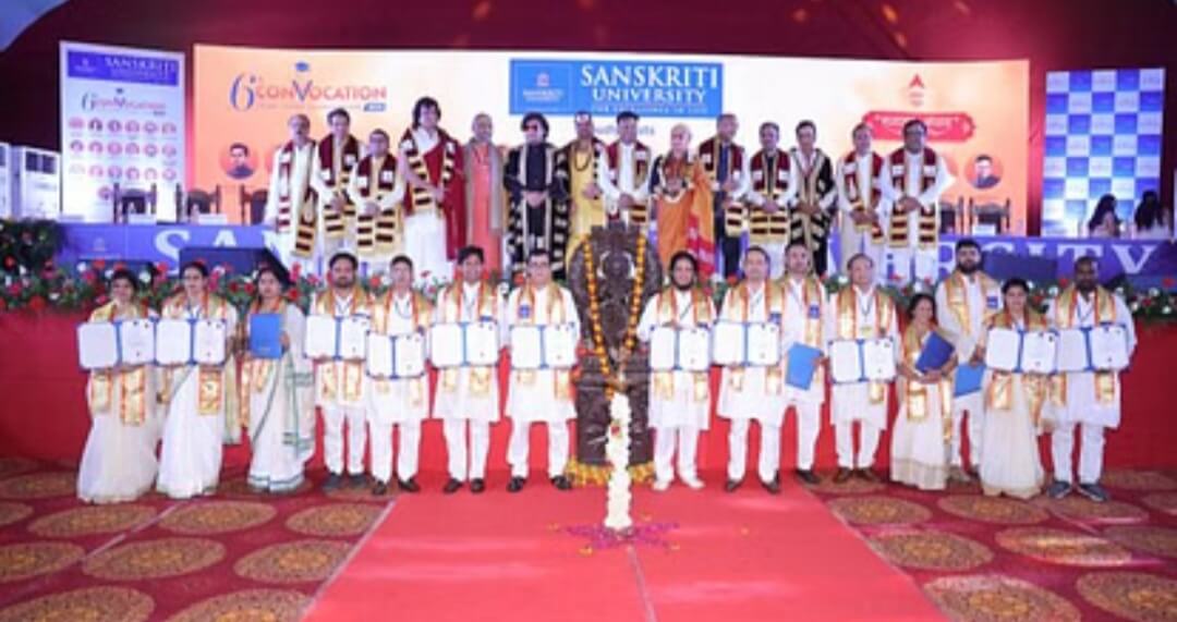 मथुरा। संस्कृति विश्वविद्यालय का छठवां दीक्षांत समारोह संतों के सानिध्य में भव्य और दिव्य वातावरण में संपन्न हुआ। विद्यार्थियों के अथक परिश्रम के परिणाम स्वरूप प्राप्त फल के रूप में उनको पदक और उपाधियां प्रदान की गईं। मां सरस्वती की प्रतिमा के समक्ष दीप प्रज्ज्वलन और राष्ट्रीयगान की परंपरा को पूर्ण करते हुए दीक्षांत समारोह का शुभारंभ हुआ। समारोह में संस्कृति विवि के कुलाधिपति डा. सचिन गुप्ता द्वारा आकाश इंस्टीट्यूट के संस्थापक, न्यूमरोलॉजिस्ट डा. जेसी चौधरी और बालीवुड के अभिनेता, कवि आशुतोष राणा को मानद उपाधि से विभूषित किया। समारोह में लगभग 2045 विद्यार्थियों को डिग्रियां प्रदान की गईं। इसके साथ ही 22 को पीएचडी की डिग्री से विभूषित किया गया।