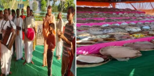 मथुरा के वृंदावन में स्थित चंद्रोदय मंदिर में कान्हा के जन्मोत्सव की खुशी में अनौखा आयोजन किया गया। यहां भगवान श्री कृष्ण की अति प्रिय गायों को 501 तरह का भोग लगाया गया। गायों को लगाए गए इस विशेष भोग 4 दिन में तैयार किया गया था। यह आयोजन मंदिर की सुरभि गौशाला में मौजूद 50 से ज्यादा गायों के लिए किया गया। भगवान श्री कृष्ण के पावन जन्म उत्सव के अवसर पर वृंदावन में स्थित चंद्रोदय मंदिर की सुरभि गौशाला में गायों को 501 प्रकार का भोग अर्पित किया गया। इस दौरान आयोजकों ने भगवान राधा कृष्ण और गौ माताओं के चरणों में प्रार्थना की गई कि उत्तर प्रदेश में गौ माता को राज्य माता का दर्जा मिले।गौशाला के प्रबंधक विवेक कुमार ने बताया कि श्री धाम वृंदावन के हलवाई काली चरन और उनके 10 साथियों ने 4 दिन तक कड़ी मेहनत कर इस भोग को तैयार किया। 4 दिन तक गायों के लिए बनाए गए गए इस भोग में सौ से ज्यादा प्रकार की मिठाईयां,150 से ज्यादा नमकीन आइटम, 56 प्रकार के लड्डू, पेठा, रोटियां,पूड़ी,गुड,सूखे मेवे, फल के अलावा सब्जियां आदि शामिल रहे।इस भोग को स्टेज पर सजाने में 4 घंटे से अधिक समय लगा। गौ माता के लिए भोग लगाने का सिलसिला दोपहर 12 बजे शुरू हुआ जो शाम 4 बजे तक चला। जब भोग को स्टेज पर सजाया गया तो श्रद्धालु भक्तो ने इस भोग के दर्शन कर अपने को धन्य किया। शाम को चंद्रोदय मंदिर के उपाध्यक्ष भरत श्राभा दास की उपस्थित में हरिनाम कीर्तन रस राज और कृष्ण दास ने प्रारंभ किया जिस को सुन श्रद्धालु भक्त नचाने पर मजबूर हो गए। इसके बाद भरत श्राभा दास प्रभु ने गौ पूजन किया और गौ माताओं को भोग अर्पण करने के पहले भगवान राधा कृष्ण को 56 भोग अर्पण किया। इस अवसर पर भरत श्राभा दास प्रभु ने गौ सेवा की महिमा को विस्तार से बताया।इस अवसर पर लखनऊ से आए उत्तर प्रदेश बीजेपी के प्रवक्ता हरीश चंद्र श्रीवास्तव ने कहा कि समिति गौ माता को राज्य माता का दर्जा मिले का जो संकल्प लेकर चल रही वह बहुत ही शुद्ध संकल्प है। जो भगवान राधा कृष्ण की कृपा से जरूर पूरा होगा। इसके बाद स्वामी अनंत वीर्य दास ने सभी श्रद्धालु भक्तो से गौ माताओं को भोग अर्पण कराया। इस धार्मिक आयोजन में वृंदावन चंद्रोदय मंदिर के उपाध्यक्ष भरत दास प्रभु के अलावा स्वामी अनंत वीर्य दास, रस राज कृष्ण दास, ग्रुप संपादक अशोक मिश्रा, पदमश्री प्रसिद्ध नृत्यांगना नलनी कमलनी, विवेक प्रभु, जितेंद्र प्रभु ,दीपक प्रभु, दशरथ,टिंकू, दिगंबर आदि शामिल रहे।