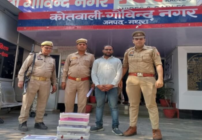 मथुरा। थाना गोविंदनगर पुलिस ने धोखाधड़ी कर चांदी की सिल्ली लेकर जाने वाले आरोपी को डीगगेट में टिकट घर के समीप से दोपहर को गिरफ्तार कर लिया। उसके कब्जे से पुलिस टीम ने 39.565 किलोग्राम वजनी सिल्ली व साढ़े तीन लाख रुपये बरामद कर चालान किया है। प्रभारी निरीक्षक गोविंदनगर कमलेश सिंह ने बताया कि सोमवार को उप निरीक्षक अरुण कुमार त्यागी, अंशुमान बिश्नोई, सूरज तेवतिया, नरेन्द्र तोमर पुलिस टीम के साथ वांछितों की तलाश में गश्त पर थे। तभी पुलिस टीम ने सटीक सूचना पर दोपहर करीब 12 बजे टिकट घर के सामने पेड़ के नीचे चबूतरा, डीग गेट के समीप से वांछित चल रहे आरोपी अजय शर्मा उर्फ नेहना, हाल निवासी हैंडपम्प वाली गली सौंख रोड व 29 बी गोविन्दपुर, हाईवे व मूल निवासी गली राजकुमार मंडीरामदास, गोविन्दनगर को गिरफ्तार किया। पुलिस ने उसके कब्जे से 39 किलो 565 ग्राम वजन की 28 सिल्ली सफेद धातु की और साढ़े तीन लाख रुपये बरामद किये। प्रभारी निरीक्षक गोविंदनगर ने बताया कि इस बारे में 13 मार्च को गोपाल यादव, निवासी सैंटर कॉलोनी, कच्ची सड़क, मसानी, गोविंदनगर ने नामजदों के खिलाफ धोखाधड़ी करने की रिपोर्ट दर्ज कराई थी। इसमें आरोप लगाया था कि नामजद उससे 50 किलो 757 ग्राम चांदी (अनुमानित मूल्य करीब 46 लाख 69 हजार 644 रुपये) ले गया था। बाद में उसने चांदी हड़प ली। पुलिस तभी से आरोपी की तलाश में थी।