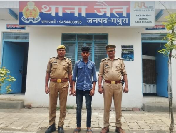 मथुरा। वरिष्ठ पुलिस अधीक्षक,मथुरा द्वारा अपराध एवं अपराधियों के विरूद्ध चलाये जा रहे अभियान के क्रम में श्रीमान पुलिस अधीक्षक नगर महोदय* के निर्देशन में श्रीमान सहायक पुलिस अधीक्षक/क्षेत्राधिकारी सदर महोदय* के निकट पर्यवेक्षण में प्रभारी निरीक्षक जैत के कुशल नेतृत्व में पुलिस टीम द्वारा बलात्कार से सम्बन्धित अभियोग में वांछित चल रहे एक नफर वांछित अभियुक्त शौकीन उर्फ डूंगर सिंह पुत्र यादराम उर्फ देवीराम निवासी ग्राम थोकदादू राल थाना जैत जिला मथुरा उम्र करीब 22 बर्ष सम्बन्धित मु0अ0सं0 282/2024 धारा 363/366/376 भा0द0वि0 ¾ पोक्सो एक्ट थाना जैत जनपद मथुरा को दिनाँक 27.06.2024 को मघेरा चौराहा पर बाटी रोड की तरफ थाना जैत मथुरा के पास से गिरफ्तार किया गया । आवश्यक विधिक कार्यवाही की जा रही है।
