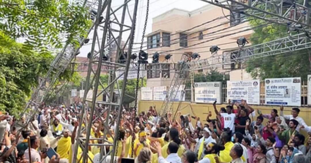 मथुरा। वृंदावन के रमणरेती क्षेत्र स्थित अपने आश्रम श्रीराधा केलिकुंज से श्रीकृष्ण शरणम स्थित निवास पर जाने के दौरान बुधवार सुबह साढ़े नौ बजे संत प्रेमानंद महाराज बाल-बाल बच गए। परिक्रमा मार्ग में लाइट के लिए लगे एंगल के फ्रेम संत प्रेमानंद महाराज के निकलने के दौरान अचानक झुक गए। इससे खलबली मच गई। हालांकि, वह एंगल झुक कर रह गए, गिरे नहीं। बुधवार सुबह संत प्रेमानंद महाराज रमणरेती स्थित अपने श्रीराधाकेलि कुंज आश्रम से चलकर निवास स्थान की ओर भक्तों के साथ पैदल जा रहे थे। तभी आश्रम से कुछ ही दूरी पर लाइट के लिए लगाए गए एंगल फ्रेम उनके वहां से निकलने के दौरान गिरने को हुआ, लेकिन वह झुक कर रह गया। संत के साथ चल रहे भक्तजनों में एंगल फ्रेम को देख खलबली मच गई और जल्द ही संत का बचाव करते हुए आगे की ओर बढ़े। गनीमत यह रही कि लोहे के एंगलों से बना लाइट फ्रेम गिरा नहीं। इस घटना की वीडियो वहां मौजूद सैकड़ों भक्तों ने बनाया, जो कि सोशल मीडिया पर तेजी से वायरल हो रहा है। चौकी प्रभारी रमणरेती लोकेंद्र ने बताया कि भीड़ के कारण फ्रेम झुक गया था, उसे संभाल लिया गया।