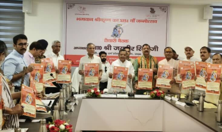 उत्तर प्रदेश ब्रज तीर्थ विकास परिषद के मा0 उपाध्यक्ष श्री शैलजाकांत मिश्र ने तैयारियों को लेकर मार्ग दर्शन किया। जिलाधिकारी शैलेंद्र कुमार सिंह ने मा0 मंत्री जी को अवगत कराया कि श्रीकृष्ण जन्माष्टमी के संबंध में जिला प्रशासन द्वारा कई बैठकें आयोजित की गई हैं, जिसमें सभी व्यवस्थाओं सुदृढ़ करने हेतु संबंधित अधिकारियों को निर्देश दिये गये हैं। उन्होंने बताया कि श्रद्धालुओं को उत्कृष्ट सुविधायें उपलब्ध कराने हेतु जिला प्रशासन एवं पुलिस विभाग कटिबद्ध है। जन्मोत्सव हेतु स्वास्थ्य, सुरक्षा, यातायात, पार्किंग, आवागमन मार्ग, विद्युत, साफ सफाई, पेयजल, शौचालय, साज सज्जा, लाइटिंग आदि हेतु निर्देश जारी कर दिये गये हैं तथा सभी अधिकारी अपने अपने कार्यों में जुटे हुए हैं, जिन्हें शीघ्र पूर्ण कर लिया जायेगा। जनपद के सभी चौराहों, मुख्य मार्गों, प्रमुख मन्दिरों आदि स्थानों पर उत्तम साज सजावट की जायेगी तथा लाइटिंग की व्यवस्था की जायेगी। मा0 मंत्री जी ने वरिष्ठ पुलिस अधीक्षक को निर्देश दिये कि विश्व प्रसिद्ध जन्मोत्सव कार्यक्रम हेतु सुरक्षा के पुख्ता इंतजाम किये जायें तथा आवश्यकतानुसार अतिरिक्त फोर्स/ पुलिस बल की मांग की जाये। सीईओ श्याम बहादुर सिंह ने बैठक की रूपरेखा प्रस्तुत की। इस दौरान भगवान श्रीकृष्ण जी के 5251वें जन्मोत्सव का पोस्टर का अनावरण/ विमोचन किया गया।