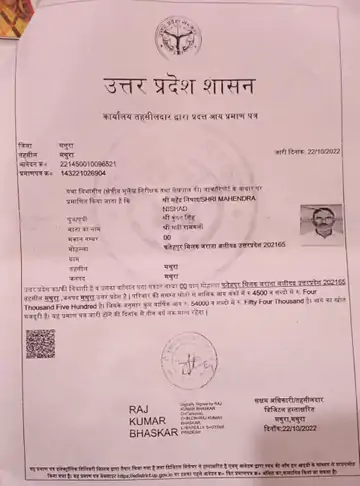 मथुरा में तहसीलदार का कारनामा सामने आया है। यहां सदर तहसील में अलीगढ़ के रहने वाले व्यक्ति का आय प्रमाण पत्र बना दिया गया। दूसरे जनपद के व्यक्ति का आय प्रमाण पत्र मथुरा में बनने का मामला चर्चा में आया तो एसडीएम ने इसकी जांच के आदेश दे दिए। मथुरा के समीपवर्ती जनपद अलीगढ़ के फतेहपुर मिलक जराना अलीगढ़ निवासी महेंद्र सिंह पुत्र कुंदर सिंह माता का नाम श्री मति रामकली ने अपना आय प्रमाण पत्र बनवाने के लिए आवेदन किया था। जिसका क्रमांक 221450010096521 था। इसमें तहसील व जिला मथुरा दर्शाया कर सदर तहसील से 22 अक्टूबर 2022 को प्रमाण पत्र जारी कर दिया गया। सदर तहसील से जारी महेंद्र सिंह के प्रमाण पत्र पर मासिक 4500 रुपए महीने और वार्षिक आय 54 हजार रुपए दिखाई गई। इस प्रमाण पत्र में पता अलीगढ़ का लिखा था केवल तहसील और जिला मथुरा इसके बाबजूद जिम्मेदारों ने आंख बंद कर अपनी रिपोर्ट लगा दी। इस प्रमाण पत्र को जारी करने से पहले अश्वनी पाण्डे, लेखपाल और तहसीलदार ने ध्यान देना भी मुनासिब नहीं समझा कि जो पता आवेदन में लिखा वह उनके कार्यक्षेत्र में आता है या नहीं।