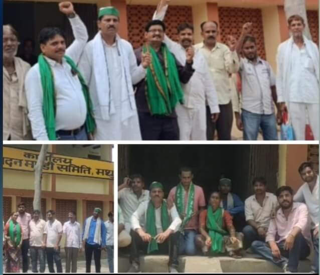 मथुरा दिनांक 9 जुलाई 2024 को भारतीय किसान यूनियन भानू के कार्यकर्ता पदाधिकारी ने किसानों की विभिन्न समस्याओं के समाधान की मांग के लिए  निर्धारित कार्यक्रम के तहत मंडी सचिव कार्यालय पर गगन भेदी नारेबाजी कर मंडी सचिव कार्यालय का धेराव किया भारतीय किसान यूनियन भानू के कार्यकर्ता जय जवान जय किसान किसानो को न्याय दो जो अधिकारी न्यायी है वह हमारा भाई है