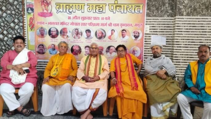 मथुरा। व्रन्दावन में अखिल भारतवर्षीय ब्राह्मण महासभा के तत्वाधान में ब्राह्मण महापंचायत का आयोजन 20 अप्रैल को भागवत मंदिरम परिक्रमा मार्ग वृंदावन में सुबह 10:00 बजे आयोजित होगी संपूर्ण ब्रज क्षेत्र से सैकड़ो ब्राह्मण उपस्थित रहेंगे। आज पत्रकार वार्ता में आयोजन समिति के पदाधिकारी संरक्षक आचार्य बद्रीश महाराज, राष्ट्रीय उपाध्यक्ष पं बिहारी लाल वशिष्ठ, कार्यक्रम अध्यक्ष आचार्यआनंदवल्लभ गोस्वामी, ब्रज क्षेत्र महामंत्री पं राजेश पाठक मुख्य संयोजक कुंड मोहन शर्मा उर्फ कल्लू पहलवान, स्वागत अध्यक्ष सुभाष गौड लाला पहलवान, आचार्य डॉ ज्ञानेंद्र किशोर गोस्वामी, ने बताया पंचायत का उद्देश्य 6 मुद्दों को सरकार के समक्ष रखना है जिसमें प्रथम मथुरा में परशुराम सभागार के लिए प्रस्तावित जगह दी जाए, ब्रजमंडल में अंडा मांस, शराब की बिक्री पर प्रतिबंध लगे, संस्कृत यूनिवर्सिटी की स्थापना हो, मंदिर के छोटे सेवायतों को सरकार पेंशन दी जाए, कृष्ण जन्मभूमि के पक्ष्कार दिनेश शर्मा का उत्पीड़न खत्म कर सुरक्षा दी जाए, विप्र आयोग का गठन हो, इस अवसर पर प्रमुख रूप से बाबा कर्मयोगी जी महाराज पं जोगेंद्र भारद्वाज आचार्य रामदेव शास्त्री कौशिक जी,विमल चैतन्य ब्रह्मचारी,आचार्य राम निहोर शास्त्री, आचार्य रसिक शास्त्री, आदि प्रमुख थे । –आनन्दवल्लभ गोस्वामी