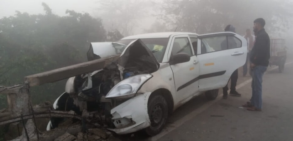 कोहरे के कारण नाले के पुल से टकराई कार ,बाल बाल बचा चालक