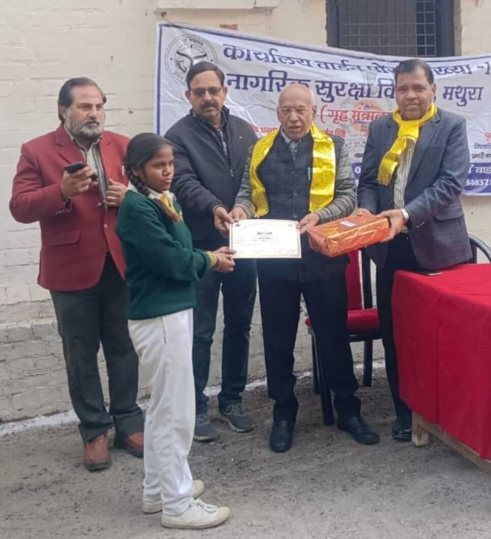 मोहित सिंघल मथुरा। नागरिक सुरक्षा संगठन द्वारा अपने स्थापना दिवस के अवसर पर आयोजित साप्ताहिक कार्यक्रमों की श्रंखला में आयोजित की गई निबंध प्रतियोगिता के विजेता छात्र छात्राओं को स्मृति चिन्ह एवं प्रमाण पत्र देकर सम्मानित किया। कलेक्ट्रेट स्थित नागरिक सुरक्षा कार्यालय पर राष्ट्रपति पदक से सम्मानित मुख्य वार्डन राजीव अग्रवाल बृजवासी एवं डिप्टी चीफ वार्डन कल्याण दास अग्रवाल बृजवासी के नेतृत्व एवं उप नियंत्रक जसवंत सिंह की अध्यक्षता में आयोजित कार्यक्रम के दौरान नन्हे-मुन्ने छात्र छात्राओं को प्रशस्ति पत्र एवं स्मृति चिन्ह प्रदान किए गए। इस अवसर पर कार्यक्रम के मुख्य संयोजक एवं पोस्ट संख्या एक के पोस्ट वार्डन अशोक यादव ने कहा कि इस प्रकार के आयोजन से छात्र-छात्राओं में नागरिक सुरक्षा संगठन के बारे में व्यापक जानकारी हासिल होगी। कार्यक्रम में शामिल रहे मुख्य वार्डन राजीव अग्रवाल बृजवासी एवं डिप्टी चीफ वार्डन कल्याण दास अग्रवाल बृजवासी ने कहा कि नागरिक सुरक्षा के द्वारा आयोजित प्रशिक्षण कार्यक्रम में छात्र-छात्राओं को प्राथमिकता के साथ हिस्सा लेना चाहिए। ताकि उन्हें जीवन रक्षा की तमाम जानकारी हासिल हो सके। उप नियंत्रक जसवंत सिंह ने कहा कि समय-समय पर नागरिक सुरक्षा संगठन स्कूल कॉलेजों के अलावा निजी एवं सरकारी कारखानों तथा सार्वजनिक स्थानों पर फर्स्ट एड एवं अग्नि से जनित घटनाओं में बचाव का प्रशिक्षण कार्यक्रम आयोजित करता रहता है। इस दौरान कार्यक्रम का संचालन सहायक उप नियंत्रक जितेंद्र देव सिंह द्वारा किया गया। पुरस्कार वितरण कार्यक्रम में सीनियर स्टाफ ऑफीसर दीपक चतुर्वेदी बैंकर ने कहा कि प्रत्येक नागरिक को नागरिक सुरक्षा के द्वारा आयोजित प्रशिक्षण कार्यक्रमों में अनिवार्य रूप से हिस्सा लेना चाहिए। ताकि आपातकालीन परिस्थिति में स्वयं तथा आम नागरिकों की जान की सुरक्षा में अहम भूमिका अदा की जा सके । इस अवसर पर डिविजनल वार्डन भारत भूषण तिवारी डिप्टी डिविजनल वार्डन राजेश मित्तल घटना नियंत्रण अधिकारी सचिन कुमार अग्रवाल पोस्ट वार्डन रविंद्र बंसल मुनव्वर वेग आदि प्रमुख रूप से मौजूद रहे थे।