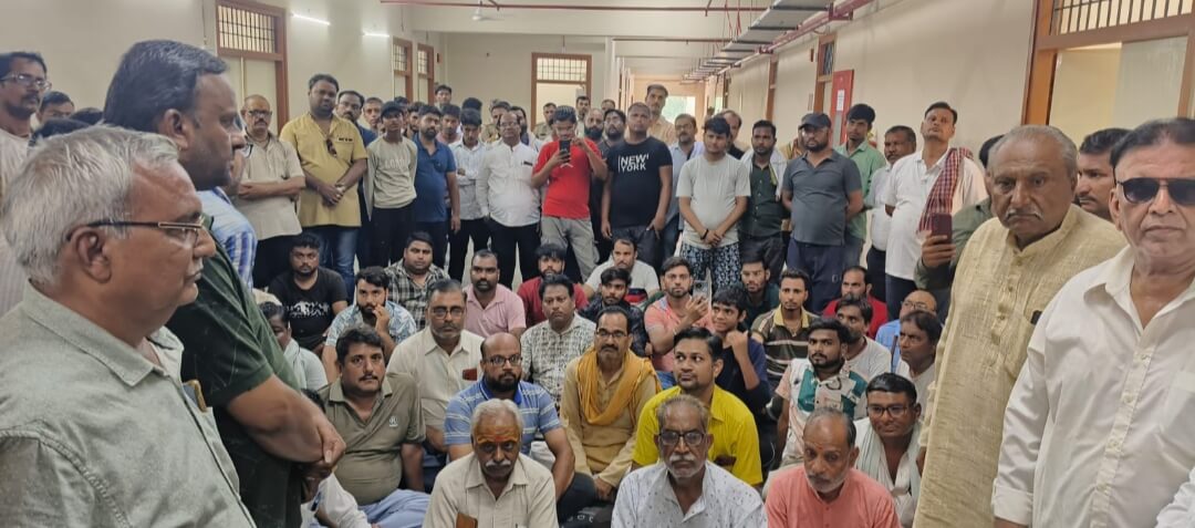 मथुरा 26 जुलाई, विगत दिवस श्री कृष्ण जन्म स्थान की व्यापारियों के यहां नगर निगम अधिकारियों व कर्मचारियों द्वारा की गई तोड़फोड़ व सामान उठा ले जानी की घटना से आक्रोशित व्यापारियों द्वारा कल से ही बाजार बंद कर प्रदर्शन किया जा रहा था आज नगर उद्योग व्यापार प्रतिनिधि मंडल की नगर अध्यक्ष सुनील अग्रवाल की नेतृत्व में श्री कृष्ण जन्म स्थान व्यवसाय समिति की सैकड़ो सदस्य व नगर पदाधिकारी द्वारा नारेबाजी कर नगर निगम कार्यालय स्थित आयुक्त कार्यालय का घेराव किया व जमकर प्रदर्शन किया जिससे मौके पर मौजूद नगर निगम अधिकारी अपनी कार्यालय छोड़कर भाग गए।