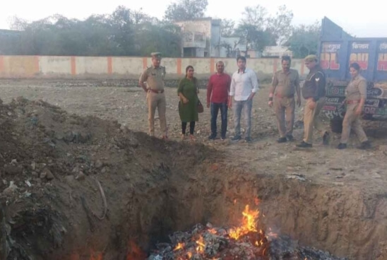 मथुरा। छाता में वरिष्ठ पुलिस अधीक्षक मथुरा शैलेश कुमार पाण्डेय के आदेशानुसार थानों पर अवैध शराब के तस्करी के मुकदमों से सम्बन्धित मालों के निस्तारण के लिए चलाये गये अभियान के क्रम में पुलिस अधीक्षक ग्रामीण त्रिगुण बिसेन व गौरव कुमार त्रिपाठी क्षेत्राधिकारी छाता के निकट पर्यवेक्षण में प्रभारी निरीक्षक थाना कोसीकलाँ द्वारा थाना कोसीकलाँ पर जब्त 42 मालों के निस्तारण के लिए रिपोर्ट तैयार कर न्यायालय श्रीमान न्यायिक मजिस्ट्रेट महोदय छाता जनपद मथुरा समक्ष प्रस्तुत की गयी, जिसमें न्यायालय श्रीमान जे0एम0 महोदय छाता जनपद मथुरा द्वारा समिति गठित कर दिनांक 03.03.2023 को शराब के विनिष्टिकरण के आदेश पारित किये गये। न्यायालय जे0एम0 छाता के शराब विनिष्टिकरण के आदेश के अनुपालन में दिनांक 05.03.2023 को शराब विनिष्टिकरण के लिए गठित समिति के सदस्यों सहायक अभियोजन अधिकारी जनपद मथुरा संजय, आबकारी निरीक्षक अंजली शर्मा क्षेत्र 02 मथुरा व कार्यालय लिपिक जे0एम0 छाता महोदय मोहित कुमार के निर्देशन में प्रभारी निरीक्षक थाना कोसीकलाँ व हैड मोहर्रिर थाना कोसीकलाँ द्वारा कुल 42 मुकदमों से सम्बन्धित माल (अवैध शराब) की कुल 6587 लीटर शराब को निर्धारित प्रक्रिया के अनुसार मण्डी परिसर थाना कोसीकलाँ मथुरा में जे0सी0बी0 की मदद से गड्ढा खुदवाकर व आग लगाकर नष्ट कराया गया तथा शराब नष्ट कराने के बाद गड़्ढे को मिट्टी से भरकर बन्द कराया गया।