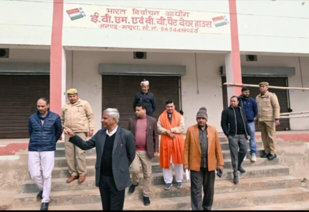 मथुरा 29 जनवरी/ जिला निर्वाचन अधिकारी / जिलाधिकारी शैलेंद्र कुमार सिंह एवं उप जिला निर्वाचन अधिकारी / अपर जिलाधिकारी वित्त एवं राजस्व योगानंद पांडेय ने मान्यता प्राप्त राष्ट्रीय / राज्जीय राजनैतिक दल के साथ ईवीएम-वीवीपैट वेयर हाउस का बाहरी निरीक्षण किया गया। मुख्य निर्वाचन अधिकारी, उ०प्र० लखनऊ एवं भारत निर्वाचन आयोग के दिये गये निर्देशों के क्रम में जिलाधिकारी / जिला निर्वाचन अधिकारी द्वारा गैर-चुनाव अवधि के दौरान मासिक रूप से वेयर हाउस में ईवीएम एवं वीवीपैट के सुरक्षित भण्डारण एवं सुरक्षा का निरीक्षण किया गया। आयोग के निर्देशानुसार बाहरी निरीक्षण के समय मान्यता प्राप्त राजनैतिक दलों के अध्यक्ष / सचिव आदि उपस्थिति रहे। जिलाधिकारी ने समस्त क्षेत्र का निरीक्षण किया, सुरक्षा व्यवस्थाओं का जायजा लिया, उपस्थित सुरक्षा कर्मियों से वार्ता की एवं उनको आवश्यक दिशा निर्देश दिए। जिलाधिकारी ने साफ-सफाई का अवलोकन किया।