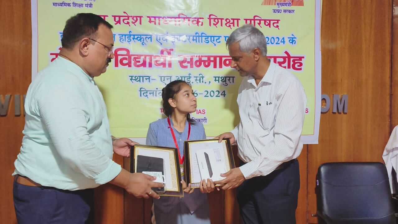 मथुरा 29 जून। माध्यमिक शिक्षा परिषद उत्तर प्रदेश प्रयागराज द्वारा आयोजित यूपी बोर्ड हाईस्कूल/इंटरमीडिएट परीक्षा 2024 में जनपद स्तर पर उत्तीर्ण मेधावी छात्र-छात्राओं के सम्मान समारोह का आयोजन कलेक्ट्रेट परिसर स्थित एनआईसी में किया गया। कार्यक्रम में जिलाधिकारी शैलेंद्र कुमार सिंह ने हाईस्कूल/इंटरमीडिएट की परीक्षा में उत्तीर्ण मेधावियों को टैबलेट, प्रमाण पत्र, गोल्ड मेडल तथा प्रशस्ति पत्र देकर सम्मानित किया। उक्त सभी विद्यार्थीयों के खातों में ऑनलाइन ट्रांजेक्शन के माध्यम से सम्मान राशि स्थानांतरण कर दी गई है, जिसमें इंटरमीडिएट के छात्रा राशि ने जनपद के साथ प्रदेश में 6वां स्थान प्राप्त करने पर रुपए 1 लाख की धनराशि भी ऑनलाइन दी गई। इंटरमीडिएट के 9 छात्र- छात्राओं क्रमशः चंचल, सोनिया, शिवा पटेल, नरेंद्र, निधि, आशु , प्रांजल सोलंकी, जितेंद्री, अरबाज खान को रुपए 21-21 हजार की सम्मान राशि दी गई है तथा हाई स्कूल के मेधावी छात्र-छात्राओं क्रमशः नीरज, आर्या सहगल, नवनीत सिंह सागर, श्रेयनवीं , आकाश तोमर, ख्याति अग्रवाल, जय नारायण, कीर्ति नेहरा, पिंकी, रतन तथा वंश पचौरी को रुपए 21-21 हजार की सम्मान राशि के साथ, प्रमाण पत्र, गोल्ड मेडल व टैबलेट देकर सम्मानित किया गया तथा उत्तीर्ण सभी मेधावियों को बधाई व शुभकामनाएं दी एवं उनके उज्जवल भविष्य की कामना की। सम्मान कार्यक्रम के दौरान जिला विद्यालय निरीक्षक भास्कर मिश्रा उपस्थित रहे।