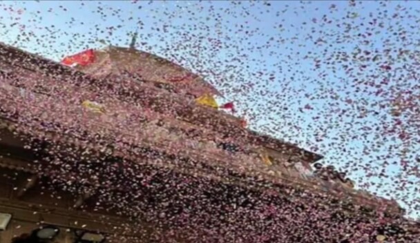 मथुरा। राधा अष्टमी पर राधारानी की क्रीड़ास्थली बरसाना राधे राधे के प्रतिध्वनि से उस समय गूंज उठा। 17 ड्रोन से लाडली मन्दिर की सफेद छतरी में सिंहासन पर विराजमान राधारानी के ऊपर फूलों की वर्षा की गयी । पूर्व निर्धारित कार्यक्रम के अनुसार बरसाना में लाड़ली मन्दिर की छतरी और राधारानी के डोला पर हेलीकाॅप्टर से फूलों की वर्षा होनी थी किंतु खराब मौसम के कारण हेलीकाप्टर बरसाना में नही उड़ सका जिसके कारण ड्रोन से ही पुष्प वर्षा करनी पड़ी । इस अनूठे दृश्य को देखकर भक्त नृत्य कर उठे तथा एक दूसरे को बधाई देने लगे। गोस्वामी समाज के कुछ लोगों के नेत्र तो भावपूर्ण भक्ति में सजल हो गए। इसके बाद गाजे बाजे और शंखध्वनि के बीच राधारानी का डोला मन्दिर के गर्भगृह की ओर रवाना हुआ तथा जैसे ही डोला मन्दिर के जगमोहन के नजदीक पहुंचा राधारानी का आरता (विशेष आरती जो पुजारी की कन्या द्वारा वर्ष में तीन बार की जाती है) किया गया तथा राधारानी को गर्भगृह में विराजमान किया गया।