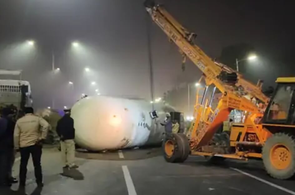 मथुरा। गोवर्धन चौराहे पर गैस कैप्सूल टैंकर अनियंत्रित होकर पलट गया। वह सोनीपत से प्रोपलीन गैस खाली कर रिफाइनरी आ रहा था। टैंकर पलटने से चारों ओर अफरा तफरी का माहौल बन गया। मौके पर पुलिस प्रशासन और रिफाइनरी के अधिकारी पहुंच गये। यह हादसा गैस कैप्सूल टैंकर के चालक द्वारा सामने चल रहे वाहन को ओवरटेक करने के चक्कर में हुआ। हादसे के बाद हाइवे पर लंबा जाम लग गया। शहर कोतवाली क्षेत्र की कृष्णा नगर चौकी के अंतर्गत रात करीब 9 बजे जैन मंदिर के समीप हुए हादसे को देख लोग घबरा गये और जयपुर जैसे हादसे के सीन आने लगे। ग़नीमत रही कि टैंकर सोनीपत से प्रोपलीन गैस खाली कर रिफाइनरी मथुरा के लिए आ रहा था। कैप्सूल टैंकर के पलटने की सूचना पर इलाका पुलिस, रिफाइनरी के कर्मचारी और दमकल विभाग की टीम मौके पर पहुंची। बताया गया कि कैप्सूल टैंकर चालक इसमें चोटिल हुआ है। उसे अस्पताल में भर्ती कराया गया है। मौके पर पहुंची रिफाइनरी की टेक्निशियन टीम द्वारा टैंकर की पड़ताल की गई और उसे हाइड्रा की मदद से करीब दो घंटे की कड़ी मशक्कत के बाद सीधा कराया गया। कैप्सूल गैस टैंकर तेज रफ्तार होने की वजह से रेलिंग को तोड़ता हुआ काफी आगे तक पहुंच गया। पलटने के कारण पूरी तरह से क्षतिग्रस्त हो गया। इस संबंध में मुख्य अग्निशमन अधिकारी नरेश कुमार सिंह ने बताया कि उन्हें सूचना मिली थी कि एक गैस कैप्सूल टैंकर अनियंत्रित होकर पलट गया है। इस सूचना पर दमकल की गाड़ी व टीम मौके पर पहुंची, लेकिन खाली कैप्सूल टैंकर होने की वजह से कोई भी हताहत नहीं हुआ है। बीच हाइवे पर गैस कैप्सूल टैंकर पलटने से लंबा जाम लग गया। दो घंटे की कड़ी में मशक्कत के बाद सीधे हुए टैंकर को हाइवे से हटाकर यातायात चालू कराया गया।