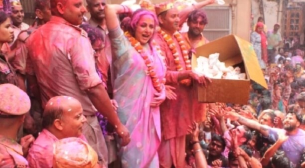 वृन्दावन। आगामी सात चरणों में होने वाले लोकसभा चुनाव में मथुरा से एक बार फिर भाजपा के टिकट पर अभिनेत्री और मथुरा सीट से सांसद हेमा मालिनी सोमवार को वृन्दावन में पार्टी कार्यकर्ताओं के साथ होली के जश्न में डूबी दिखीं। इस अवसर पर होली के उत्साह में डूबी अभिनेत्री ने न केवल सभी को होली की शुभकामनाएं दीं, बल्कि फिल्म ‘शोले’ का अपना चार्ट-बस्टिंग नंबर ‘होली के दिन’ भी गाया।