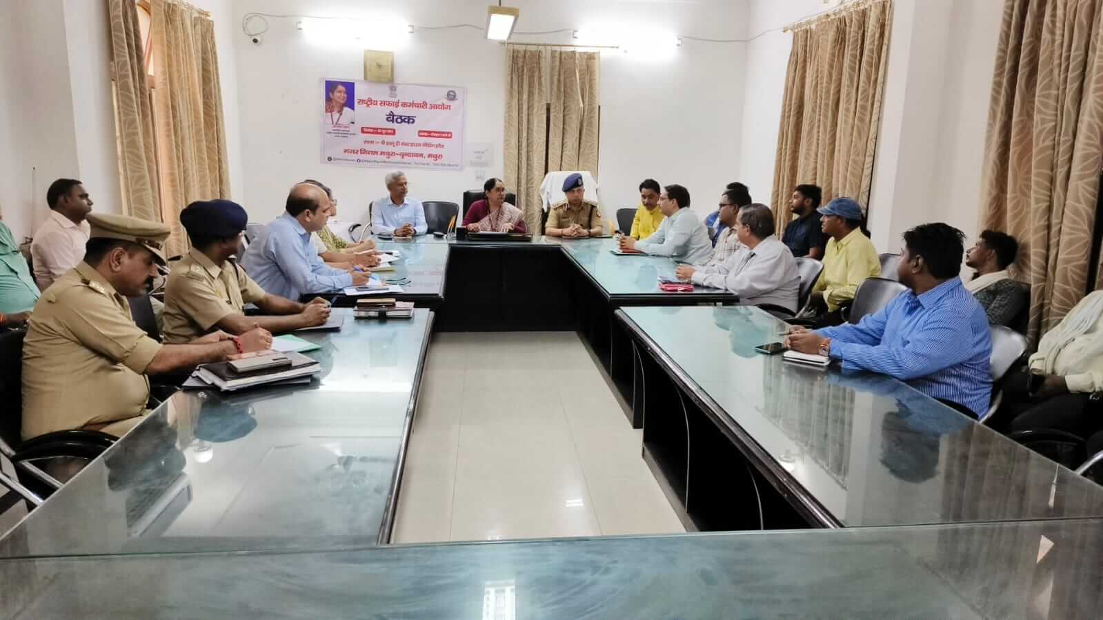 मथुरा 20 जून। राष्ट्रीय सफाई कर्मचारी आयोग भारत सरकार की मा० उपाध्यक्ष श्रीमती अंजना पंवार ने लोक निर्माण विभाग के निरीक्षण भवन के सभागार में जिलाधिकारी शैलेन्द्र कुमार सिंह तथा वरिष्ठ पुलिस अधीक्षक शैलेश कुमार पाण्डेय सहित अन्य संबंधित विभागों के अधिकारियों के साथ बैठक ली। उन्होंने बताया कि राष्ट्रीय सफाई कर्मचारी आयोग के सदस्यों द्वारा देश के प्रत्येक राज्यों में भ्रमण किया जाता है तथा सफाई कर्मचारियों के संबंध में बैठकें की जाती हैं। उन्होंने बताया कि सफाई कर्मचारियों की आर्थिक, सामाजिक, शैक्षिक एवं शैक्षणिक उत्थान हेतु राष्ट्रीय सफाई कर्मचारी आयोग कार्य कर रहा है।