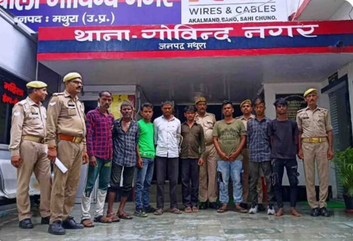 मथुरा 10 सितंबर 2023 प्रभारी निरीक्षक गोविन्दनगर ललित भाटी, स्वाट टीम व अन्य पुलिसकर्मियों द्वारा दिनांक 09/09/2023 को डकैती की योजना बना रहे 08 शातिर बदमाशों को जन्मभूमि लिंक रोड पुल के नीचे तपेश्वर महादेव मन्दिर मोड खोखा के पास से समय करीब 23.30 बजे गिरफ्तार किया गया। अभियुक्तगण के विरूद्ध नियमानुसार अभियोग पंजीकृत किया गया है और अभियुक्तगण को माननीय न्यायालय के समक्ष पेश किया जा रहा है। घटना का संक्षिप्त विवरण – मथुरा एक पर्यटक शहर है जहां दिनांक 07/08/2023 को जन्माष्टमी का प्रोग्राम था, मथुरा में काफी भीड़ थी तो सभी अभियुक्तगण ने मिलकर यहां चोरी, लूट व डकैती की घटना को अंजाम देने का प्लान बनाया था लेकिन दांव न लग पाने के कारण किसी घटना को अंजाम नही दे सके। दिनांक 09/09/2023 की रात्रि को इनके द्वारा मथुरा शहर में डकैती जैसी घटना कारित किये जाने की योजना बनाई जा रही थी जिसके लिए ये सभी 08 अभियुक्तगण सुनसान जगह जन्मभूमि लिंक रोड पुल के नीचे तपेश्वर महादेव मन्दिर मोड खोखा के पास एकत्रित हुये थे और वहां डकैती जैसी घटना को अंजाम देने की फिराक में बैठे थे और अधिक रात्रि होने का इन्तजार कर रहे थे तभी मुखबिर की सूचना पर पुलिस वहां पहुँची और कुल 08 बदमाशों को गिरफ्तार किया गया।