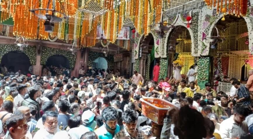 मथुरा। वृंदावन में ठाकुर बांकेबिहारी मंदिर में दर्शन के लिए भक्तों की भीड़ का दबाव बनने लगा तो हालात बिगड़ते नजर आए। दिन चढ़ने के साथ ही भीड़ का दबाव मंदिर के आने वाले दोनों रास्तों पर बन गया। बैरियर पर श्रद्धालुओं को रोका जाना भारी पड़ रहा है। हालात ये कि मंदिर आने वाले रास्तों विद्यापीठ और जुगलघाट से मंदिर के चबूतरे तक भीड़ का दबाव बना हुआ है। भीड़ के दबाव और तेज धूप के कारण पसीने से लथपथ श्रद्धालुओं की हालत बिगड़ रही है। महिलाओं, बच्चों की हालत भीड़ के दबाव में खराब हो रही है। भीड़ के दबाव से बाहर निकलने को बच्चे और महिलाओं की चीख सुनाई दे रही है। भीड़ नियंत्रण के लिए प्रशासनिक व्यवस्था पूरी तरह ध्वस्त नजर आ रही है। बैरियर पर श्रद्धालुओं को रोका जा रहा है तो दबाव लगातार बढ़ने से श्रद्धालुओं की हालत बिगड़ रही है। तीन दिन की सार्वजनिक छुट्टी पड़ने के कारण शनिवार से ही फूलबंगला में विराजित ठाकुर बांकेबिहारी मंदिर में श्रद्धालुओं की भीड़ में वृद्धि होने लगी थी। रविवार की सुबह तो हालात बिगड़ते नजर आए। मंदिर खुलने के साथ ही हजारों श्रद्धालुओं की भीड़ पहले से जमा थी, मंदिर में प्रवेश कर गई। दिव्य फूलबंगला में विराजित ठाकुर बांकेबिहारीजी के दर्शन के साथ माला प्रसाद अर्पित करने को श्रद्धालुओं का मंदिर में ठहराव हो गया। ऐसे में मंदिर के बाहर लगातार श्रद्धालुओं की संख्या में वृद्धि होने के कारण भीड़ का दबाव बनने लगा और बैरियरों पर श्रद्धालुओं की हालत खराब होने लगी। मंदिर आने वाले दोनों रास्तों पर भक्तों की भीड़ का दबाव ही नजर आ रहा है।