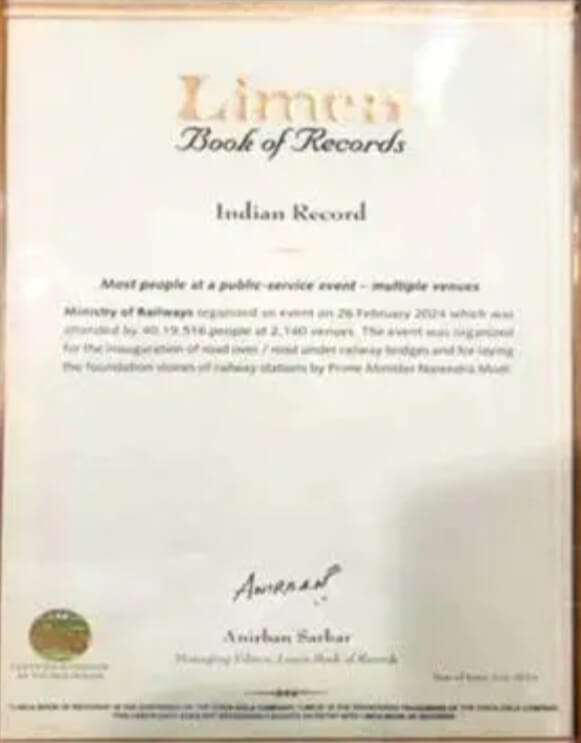 मथुरा। कई स्थानों पर एक साथ सार्वजनिक सेवा कार्यक्रम में सबसे अधिक लोगों के शामिल होने का भारतीय रिकॉर्ड बना है। प्रधानमंत्री नरेंद्र मोदी द्वारा ऊपर/नीचे सड़क रेलवे पुलों के उद्घाटन और रेलवे स्टेशनों की आधारशिला रखने के लिए 26 फरवरी 2024 को आयोजित कार्यक्रम में 2,140 स्थानों पर 40,19,516 लोगों ने भाग लिया। जिस कारण भारतीय रेलवे का सार्वजनिक सेवा कार्यक्रम में सबसे अधिक लोगों के शामिल होने का प्रतिष्ठित लिम्का बुक ऑफ रिकॉर्ड्स में अपना नाम दर्ज हुआ है। भारतीय रेलवे के विशाल प्रयास को मान्यता दी गई है और इसे प्रतिष्ठित लिम्का बुक ऑफ वर्ल्ड रिकॉर्ड्स में दर्ज किया गया है।