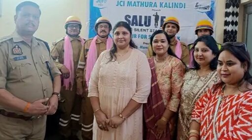 मथुरा । जेसीआई मथुरा कालिंदी द्वारा सैल्यूट टू साइलेंट प्रोजेक्ट के अंतर्गत अग्नि शामक विभाग पर जाकर मुख्य अग्नि शामक अधिकारी नरेंद्र प्रताप सिंह ,लीडिंग फायर मेन दुर्गा प्रसाद , फायर सर्विस ड्राइवर सत्यवीर सिंह,फायर मेन विवेक सारस्वत व देवेंद्र सिंह का स्वागत व स्मृति चिन्ह देकर सम्मान किया गया। कार्यक्रम का संचालन मिताली फौजदार ने किया व बताया की फायर विभाग कर्मचारी वास्तविक अभिनेता हैं जो की बिना किसी भी अभिलाषा के अपने काम में तत्पर रहते हैं। इस अवसर पर अध्यक्ष ममता अग्रवाल कोषाध्यक्ष अंजलि खंडेलवाल,ज्योति मित्तल,निमिषा अग्रवाल,साधना भार्गव,निधि शर्मा उपस्थित रहीं ।