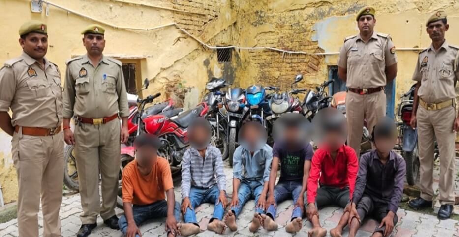 मथुरा। थाना कोतवाली, हाईवे पुलिस व स्वाट टीम मथुरा की संयुक्त कार्यवाही से शातिर वाहन चोर गैंग के 06 अपराधियों को 10 चोरी की मोटर साइकिल/स्कूटी सहित गिरफ्तार किया है। वरिष्ठ पुलिस अधीक्षक मथुरा महोदय* द्वारा अपराधों की रोकथाम एवं अपराधियों की गिरफ्तारी हेतु चलाये जा रहे अभियान के क्रम में पुलिस अधीक्षक नगर महोदय* के निर्देशन में क्षेत्राधिकारी नगर महोदय* के निकट पर्यवेक्षण में प्रभारी निरीक्षक थाना कोतवाली मथुरा के कुशल नेतृत्व में थाना कोतवाली, हाईवे व स्वाट टीम द्वारा आज दिनांक 25.08.2024 को समय करीब 01.40 बजे चैकिंग के दौरान अलवर बाजना रेलवे पुल के पास खाली पड़ी सुनसान कच्ची सड़क के किनारे चौकी क्षेत्र कृष्णानगर थाना कोतवाली से अभियुक्तगण 1. सुमित पुत्र ओमप्रकाश नि0 इन्द्रपुरी कालोनी (कान्हा पुत्र छत्तर के मकान मे किराएदार) थाना हाईवे जनपद मथुरा उम्र 21 वर्ष, 2. प्रेमपाल उर्फ बोना पुत्र बिशन नि0 इन्द्रपुरी कालोनी (अंबेडकर पार्क के पीछे ) थाना हाईवे जनपद मथुरा उम्र 20 वर्ष, 3. पवन पुत्र जगवीर नि0 इन्द्रपुरी कालोनी ( शराब के ठेके के पास ) थाना हाईवे जनपद मथुरा उम्र 19 वर्ष, 4. विनय कुमार पुत्र गब्बर नि0 गुलाब नगर इन्द्रपुरी कालोनी थाना हाईवे जनपद मथुरा उम्र 22 वर्ष, 5. लाला उर्फ रिती पुत्र रमेश सिंह नि0 इन्द्रपुरी कालोनी (सुरेश आर.ओ. प्लांट वाले के मकान में किरायेदार) थाना हाईवे जनपद मथुरा उम्र 19 वर्ष व 6. रवि कुमार पुत्र सुन्दर नि0 इन्द्रपुरी कालोनी (अम्बेडकर पार्क के पास ) थाना हाईवे जनपद मथुरा उम्र 21 वर्ष को गिरफ्तार किया गया । अभियुक्तगण उपरोक्त के कब्जे से चोरी किये गये चोरी के कुल 10 वाहन (08 मोटर साइकिलें व 02 स्कूटी) बरामद की गई । बरामद चोरी के वाहनो के सम्बन्ध में जनपद के अन्य थानों व अन्य जनपदों से जानकारी की जा रही है। गिरफ्तारशुदा अभि0गण उपरोक्त के विरूद्ध नियमानुसार अभियोग पंजीकृत कर थाना कोतवाली से विधिक कार्यवाही की जा रही हैं ।