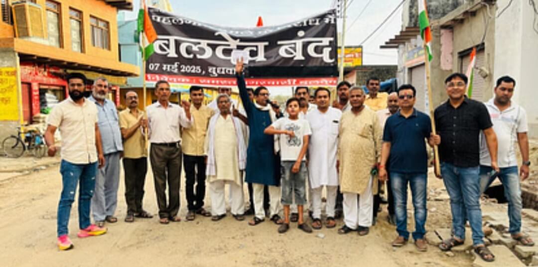 मथुरा। बरसाना में पहलगाम हमले के विरोध में आज बरसाना कस्बे में बाजार बंद रहा। इस दौरान पूर्व फौजी व ग्रामीण विरोध प्रदर्शन किया नगर पंचायत चेयरमैन प्रतिनिधि पदम फौजी ने माइक से अनाउंस कराकर दुकानदारों से अपने प्रतिष्ठान बंद रखी। पदम फौजी ने कहा कि पहलगाम में देश पर्यटकों की गोली मारकर हत्या करने के लोगों में उबाल है। बुधवार को कस्बे का बाजार पूर्णतः बंद रहा। व्यापारी व लोगों से ज्यादा से ज्यादा संख्या में पीली कोठी तिराहे पर एकत्र होने की अपील की। बलदेव में पहलगाम हमले के विरोध में कस्बे के बाजार आज बंद रहें। मंगलवार को रैली निकाल कर व्यापारियों से दुकानें बंद रखने की अपील की गई। रैली नगर के प्रमुख मार्गों से होकर निकली। रैली में चेयरमैन डॉ. मुरारी लाल अग्रवाल, नरेंद्र गोयल, चेतन उपाध्याय, संजीव अग्रवाल, सुरेश भारद्वाज, विपिन दीक्षित, दिनेश अग्रवाल, बबलू सोनी, मधुकर पांडेय, नारायण पांडेय, सोनू सिकरवार आदि मौजूद रहे।