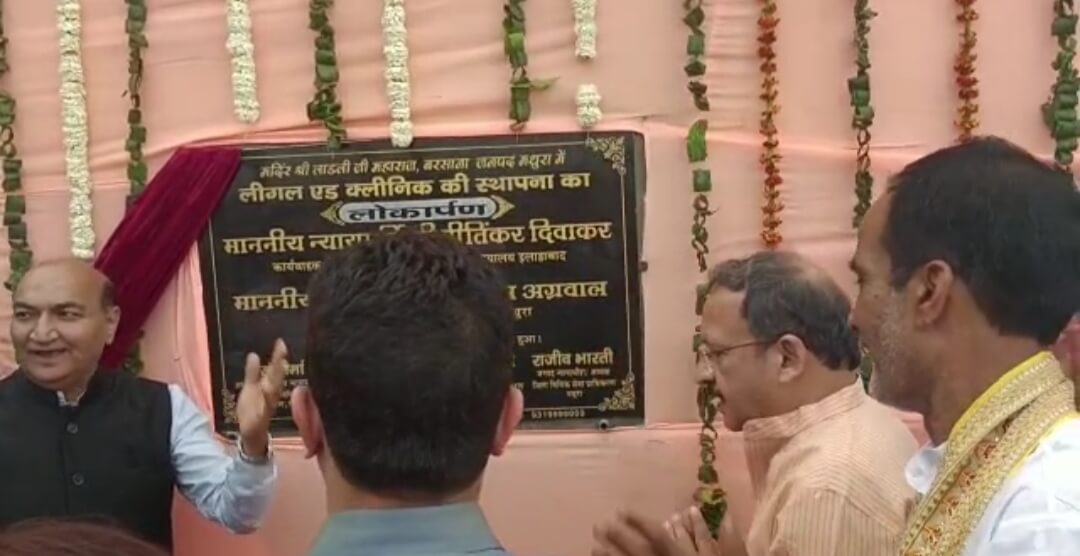 मथुरा। राष्ट्रीय विधिक सेवा प्राधिकरण, नई दिल्ली तथा उ0प्र0 राज्य विधिक सेवा प्राधिकरण, लखनऊ के निर्देशानुसार जिला विधिक सेवा प्राधिकरण, मथुरा के तत्वावधान में एक लीगल एड क्लीनिक की स्थापना श्री लाड़ली जी महाराज मंदिर बरसाना, जनपद मथुरा में की गई। जिसका उद्घाटन समारोह दिनांक 09.03.2023 दिन गुरूवार को सांय 05.00 बजे किया गया। इस लीगल एड क्लीनिक का उद्घाटन माननीय न्यायमूर्ति श्री प्रीतिंकर दिवाकर, कार्यवाहक मुख्य न्यायाधीश, माननीय उच्च न्यायालय, इलाहाबाद / कार्यपालक अध्यक्ष, उ0प्र0 राज्य विधिक सेवा प्राधिकरण, लखनऊ द्वारा किया गया। इस उद्घाटन समारोह में माननीय जनपद न्यायाधीश / अध्यक्ष जिला विधिक सेवा प्राधिकरण, मथुरा श्री राजीव भारती, सदस्य सचिव, उ०प्र० राज्य विधिक सेवा प्राधिकरण, लखनऊ श्री संजय सिंह, विशेष कार्याधिकारी श्री भागीरथ वर्मा, अपर जिला एवं सत्र न्यायाधीश / नोडल अधिकारी लोक अदालत श्री अभिषेक पाण्डेय, अपर जिला एवं सत्र न्यायाधीश / सचिव, जिला विधिक सेवा प्राधिकरण, मथुरा श्रीमती नीरू शर्मा, जिलाधिकारी मथुरा श्री पुलकित खरे, वरिष्ठ पुलिस अधीक्षक श्री शैलेश पाण्डेय, मुख्य न्यायिक मजिस्ट्रेट श्री उत्सव गौरव राज सहित अनेक न्यायिक, पुलिस व प्रशासनिक अधिकारीगण, पराविधिक स्वयंसेवकगण, श्री लाड़ली जी महाराज मंदिर बरसाना के पदाधिकारीगण, पराविधिक स्वयंसेवक, जिला विधिक सेवा प्राधिकरण मथुरा के कर्मचारीगण आदि उपस्थित रहे।