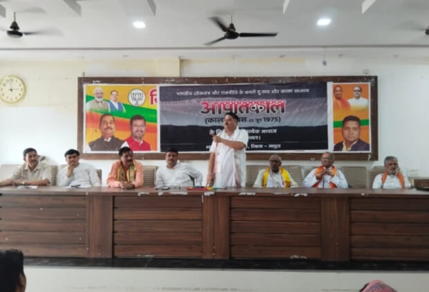 मथुरा। पुष्पांजलि स्तिथ जिला कार्यालय पर मंगलवार को भारतीय जनता पार्टी ने 25 जून 1975,आपातकाल काला दिवस मनाया। जिसकी अध्यक्षता निर्भय पांडे ने की। बैठक में बृज क्षेत्र महामंत्री नागेन्द्र सिकरवार ने बताया कि आज 25 जून है, आज के ही दिन 1975 को देश में आपातकाल लगा था. इंदिरा गांधी के मंत्रिमंडल की सिफारिश पर तत्कालीन राष्ट्रपति फखरुद्दीन अली अहमद ने इमरजेंसी की घोषणा की थी. यह पहली बार नहीं था जब देश में इमरजेंसी लगाई गई थी. 1975 में तीसरी बार इसकी घोषणा हुई.। बैठक को सम्भोदित करते हुए गोकुल विधायक पूरन प्रकाश ने बैठक में उपस्थित लोकतंत्र सेनानियों के स्वागत किया और उनके बारे अवगत कराया।अध्यक्षता कर रहे जिला अध्यक्ष निर्भय पांडे ने बताया की भाजपा का आगामी कार्यक्रम मतदाता अभिनंदन यात्रा 23 जून से 6 जुलाई तक चलेगा इसमें प्रत्येक कार्यकर्ता को एक पेड़ मां के नाम कैंपेन भी देश भर में चलाने जा रही है पीएम मोदी ने विश्व पर्यावरण दिवस 5 जून को एक पेड़ मां के नाम अभियान की शुरुआत और एक पौधा लगाकर की थी।जिला मीडिया प्रभारी श्याम चतुर्वेदी ने बताया कि आगामी कार्यक्रम एक पेड़ मां के नाम के अन्तर्गत सभी कार्यकर्ताओं को अपनी माँ के साथ एक पौधा लगाना होगा, और उसकी देखभाल भी उसी को करनी है। बैठक में जिलाध्यक्ष निर्भय पांडे विधायक पूरन सतपाल चौधरी अजय परखम, जिला मीडिया प्रभारी श्याम चतुर्वेदी , सह मीडिया प्रभारी श्याम शर्मा,राम कुमार गौतम, अमन ठाकुर,महिलामोर्चा जिला अध्यक्ष मुदित शर्मा ,उपाध्यक्ष मनीष पाराशर ,ज्ञानेंद्र ठाकुर, तरुण सैनी नरेंद्र गौतम,अंकित सक्सेना, आदि लोग बैठक में मौजूद रहे।