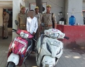मथुरा में पुलिस ने एक शातिर चोर को गिरफ्तार किया है। कोई शक न करे, इसके लिए साधु का वेश धारण करके घूमता रहता। उसके बाद मौका पाकर स्कूटी चुराकर फुर्र हो जाता। इस अंतरजनपदीय चोर को हाईवे पुलिस ने कान्हा माखन स्कूल के पास खाली पड़े मैदान से पकड़ा है। इसके पास से दो स्कूटी बरामद हुई हैं। एक स्कूटी मथुरा तो दूसरी स्कूटी फर्रुखाबाद से चुराई गई है। फिलहाल हाईवे पुलिस शातिर चोर से जानकारी जुटा रही है। 21 मार्च को इंड्रस्ट्रियल एरिया से स्कूटी चोरी होने का मुकदमा दर्ज करके हाईवे पुलिस चोर की तलाश में जुट गई। सोमवार को थाना हाईवे के एसएचओ उमेश चंद त्रिपाठी और एसआई योगेश कुमार टीम के संग सलेमपुर रोड पर चेकिंग में जुटे थे। तभी शातिर चोर को पकड़ लिया। उसके पास से दो चोरी की स्कूटी बरामद कीं। पूछताछ में शातिर चोर ने स्कूटी चोरी करना स्वीकार किया। एसपी सिटी मार्तंड प्रकाश सिंह ने बताया कि पकड़ा गया अंतरजनपदीय चोर दीपक उर्फ महाकाल गिरि पुत्र राजू उर्फ जंगबहादुर वर्मा निवासी कोटला रोड सविता नगर गोवर्धन स्कूल के पास, फिरोजाबाद है। इसके पास से मथुरा और फर्रुखाबाद से चुराई स्कूटी बरामद हुई हैं। खास यह है कि साधु का वेश धारण करके पहले यह रेकी करता था। उसके बाद निशाने पर आई स्कूटी को चोरी करके फुर्र हो जाता था।