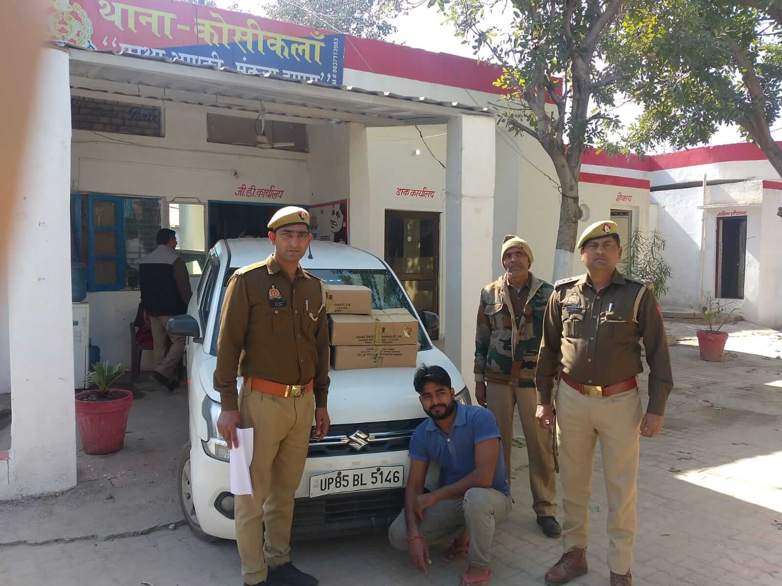 मथुरा पुलिस ने वरिष्ठ पुलिस अधीक्षक शैलेश कुमार पाण्डेय के नेतृत्व में आज शराब तस्करी के विरुद्ध बड़ कार्यवाही हुई। जनपद की छाता पुलिस ने 2600000 रुपए की शराब से भरे ट्रक सहित तस्कर पकड़ा जबकि कोसी पुलिस ने 5 पेटी शराब सहित वैगनआर कार सवार युवक को गिरफ्तार किया। थाना कोसीकलाँ पुलिस द्वारा गैर प्रान्त से अवैध शराब की तस्करी करने वाले शराब तस्कर को हरियाणा की अवैध देशी शराब की 5 पेटियों (240 पौव्वा) व शराब की तस्करी में प्रयुक्त वैगन आर कार के साथ गिरफ्तार किया गया है। थाना कोसीकलाँ पुलिस व्दारा गैर प्रान्त से शराब की तस्करी करने वाले शराब तस्कर को उस समय गिरफ्तार किया गया, जब अभियुक्त उक्त शराब को गढीपट्ठी होडल से खरीदकर अपनी कार वैगन आर से अपने घर ले जा रहा था। पुलिस टीम को गश्त व चैकिंग के दौरान मुखबिर खास ने सूचना दी कि ग्राम लालपुर की तरफ से एक सफेद रंग की कार में शराब तस्कर अवैध शराब भरकर ला रहे हैं। इस सूचना पर विश्वास कर पुलिस टीम द्वारा चौकी गढीबरवारी पर बैरियर लगाकर चैकिंग की जा रही थी। चैकिंग के दौरान, ग्राम लालपुर की तरफ से आ रही एक कार को चैकिंग हेतु रुकने का इशारा किया गया तो पुलिस टीम को देखकर कार के चालक नें कार को रोककर खिडकी खोलकर कार से उतरकर ग्राम कामर की तरफ भागने लगा जिसे पुलिस टीम द्वारा घेर घोटकर आवश्यक बल प्रयोग करते हुए पकड लिया, पकडे गये व्यक्ति से भागने का कारण पूछा तो पकड़े गये व्यक्ति नें बताया कि मैं हरियाणा से देशी शराब सस्ते दामों में लेकर आता हूँ, जिसे मैं अपने घर पर महँगे दामों में बेचकर अच्छा-खासा मुनाफा कमाता हूँ, इससे मैं अपना व अपनी परिवार का खर्चा चलाता हूँ, आज भी मैं अपनी कार की डिग्गी में अवैध देशी शराब गढीपट्टी होडल वाले ठेके से खरीदकर ला रहा था, परन्तु आज आप लोगों नें पकड़ लिया, पकड़ी गयी कार की डिग्गी को खोलकर देखा गया तो कार की डिग्गी से कुल 05 पेटी अवैध देशी शराब हरियाणा मार्का बरामद हुई, अभियुक्त के पास हरियाणा की शराब रखने व उसे परिवहन करने से सम्बन्धित कोई दस्तावेज ना होने के कारण अभियुक्त को चौकी गढ़ी बरवारी बैरियर से आज 07.02.2023 को समय करीब 10:35 बजे गिरफ्तार कर उसके विरुद्ध विधिक कार्यवाही की गयी ।