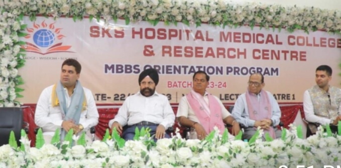 22.09.2023 का शुभारम्भ किया गया। संस्थान के चेयरमैन श्री एस.के.शर्मा जी ने माँ सरस्वती के सम्मुख दीप प्रज्जवलित करते हुुए कार्यक्रम का शुभारम्भ किया । साथ ही संस्था के चेयरमैन ने जानकारी देते हुए बताया कि एन0एम0सी0 (नेशनल मेडिकल कमीशन) द्वारा संस्थान एस.के.एस मेडिकल कॉलेज को शिक्षण सत्र् 2023-24 हेतु 150 सीटों का मान्यता पत्र प्रदान किया गया। देश के विभिन्न राज्यों से छात्रों ने अपना प्रवेश एस0 के0 एस0 मेडीकल कॉलेज संस्थान में लेना सुनिश्चित किया है। चेयरमेन सर ने छात्रों को बताया कि सदैव अपना कार्य ईंमानदारी और ट्टढ संकल्प से करें, यदि आपको जीवन में सफलता प्राप्त करनी हैं तो आपका ट्टढ निश्चय और आपकी मेहनत ही आपको सफलता प्राप्त करा सकती हैं । उन्होने यह भी बताया कि परमात्मा के बाद डॉ0 ही दूसरे स्थान पर पूज्यनीय है क्योंकि किसी भी स्वास्थ्य संबधी परिस्थिति में मनुष्य सदैव डॉ0 पर ही आश्रित होता है । अंत में उन्होने सभी को एक सफल डॉ0 बनने का शुभकामनाएं देते हुये सभी का अभिनंदन किया। संस्थान के प्राचार्य डॉ राजेन्द्र सिंह चना (भूतपूर्व प्रोफेसर ए0एम0यू0) ने छात्रों को मेडिकल शिक्षा के महत्व के विषय में जानकारी दी और कहा कि जीवन में मेहनत ही सफलता की कुंजी है। इस कार्यक्रम के अतिथि के रूप में श्री यू0के0 मित्तल (भूतपूर्व डायरेक्टर SAIL) जी मौजूद रहे उन्होनें नवांगतुकों को अपने उज्ज्वल भविष्य के लिए शुभकामनाऐं दी और अपने जीवन में सफलता हासिल करने के लिए कुछ महत्वपूर्ण बातों को छात्रों के समक्ष व्यक्त किया और इस कार्यक्रम में मौजूद अतिथि के रूप में डॉ0 गौरव भारद्वाज (डायरेक्टर सिटी हॉस्पीटल,मथुरा) ने छात्रों को एक अच्छा एवं जिम्मेदार डॉक्टर बनने की महत्वता को समझाते हुए कहा कि देश में जितने ज्यादा से ज्यादा अच्छे डॉक्टरों का निर्माण होगा यह देश उतनी ही तेज गति से चिकित्सा के क्षेत्र में तरक्की करेगा तथा स्वास्थ्य एवं स्वाभिलाम्बी देश का निर्माण होगा। तदोपरांत संस्था के सचिव (Secretary )श्री मयंक गौतम जी ने अपने संस्थान में आये सभी छात्रों का ह्रदय से स्वागत किया और कॉलेज एवं अस्पताल की सुविधाओं और उपलब्धियों का विवरण साझा किया और उन्होंने आने वाले वर्षो में चिकित्सा क्षेत्र में एक बेहतर चिकित्सा सुविधा देने के लिए प्रतिबद्ध है। श्री उत्कर्ष गौतम (एम0डी0 एस.के.एस. हॉस्पीटल) ने भी नवागंतुक एम0बी0बी0एस0 के छात्रों का स्वागत किया और उज्जवल भविष्य के लिए शुभकामनाऐं दी।