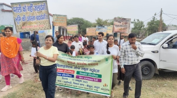 मथुरा। उत्तर प्रदेश पंडित दीनदयाल उपाध्याय पशु चिकित्सा विज्ञान विश्वविद्यालय एवं गौ अनुसंधान संस्थान मथुरा के अधीन संचालित कृषि विज्ञान केंद्र मथुरा द्वारा आज गांव ददीगढी, विकासखंड चौमुहां जिला मथुरा में यथा स्थान फसल अवशेष प्रबंधन परियोजना के अंतर्गत स्कूल विद्यार्थी जागरूकता कार्यक्रम का आयोजन किया गया यह कार्यक्रम माननीय कुलपति प्रोफेसर एके श्रीवास्तव, निदेशक प्रचार डॉ अतुल सक्सेना केंद्र प्रभारी डॉक्टर वाई. के. शर्मा के दिशा निर्देशन में किया गया केंद्र के वैज्ञानिक डॉ रविंद्र कुमार राजपूत द्वारा विद्यार्थियों को पराली न जलाने हेतु प्रेरित किया तथा पराली के विषय में जानकारी दी,  जिसमें खेत में मिलाने से उर्वरा शक्ति बढ़ती है खेत के सूक्ष्मजीव पनपते हैं तथा पराली में आग लगने से वातावरण प्रदूषित होता है तथा कई तरह की बीमारियां जैसे आंखों में जलन त्वचा संबंधी रोग श्वांस संबंधी रोग इत्यादि की समस्या पैदा होती है। पराली को खेत में मिलने के लिए सुपर सीडर, हैप्पी सीडर,मल्चर  स्ट्रॉ मैनेजमेंट सिस्टम, स्मार्ट सुपर सीडर, रिवर्सिबल एम. बी. प्लाउ आदि मशीन है जिसे पराली को खेत में मिलाया जा सकता है पराली को  खेत में मिलाने खेत की उपजाऊ शक्ति बढ़ती  है तथा किसानों को अधिक लाभ होगा साथ ही साथ आगामी गेहूं की फसल की बुवाई समय से की जा सकती है। कार्यक्रम में 60 से अधिक विद्यार्थियों ने भाग लिया जिसमें चित्रकला प्रतियोगिता, निबंध लेखन प्रतियोगिता एवं वाद विवाद प्रतियोगिता के साथ-साथ रैली का भी आयोजन कराया गया जिसमें प्रथम, द्वितीय व तृतीय स्थान पर आए विद्यार्थियों राधिका, भावना, जानकी, राजेश्वरी, प्रीति, शौकीन, राधा, किशन सिंह, प्रियंका क़ो पुरस्कृत किया गया व प्रशस्ति पत्र दिया गया है उच्च प्राथमिक विद्यालय ददी गढी के अध्यापक श्री लाल सिंह, श्री कृष्णा शर्मा, सत्य प्रकाश, रीना गौतम, रेखा प्रसाद अरूणा कुमारी, के अलावा रावे के विद्यार्थी शिवांशु, राजू, सौरभ अनु,अलका, संजीत, नैना, राहुल नेहा, अविनाश  नवीन आदि उपस्थित रहे।