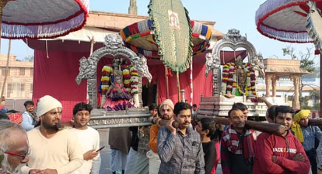 मथुरा। वृंदावन के रंगनाथ मंदिर में पंचदिवसीय गोदा रंगमन्नार विवाहोत्सव के अंतिम दिन सोमवार को श्रीलक्ष्मी स्वरूपा मां गोदा का विवाह भगवान रंगनाथ से हुआ। विवाह उत्सव अंतर्गत पुस्कर्णी द्वार के समीप माला अदला बदली की गई। वैष्णव संप्रदाय की धार्मिक मान्यता के अनुसार, दक्षिण भारत के विल्लीपुत्तुर नामक ग्राम निवासी भगवद भक्त विष्णुचित्त भट्ट नाथ स्वामी की पुत्री रूप में अवतरित देवी गोदा ने भगवान विष्णु को पति रूप में पाने के लिए पौष मास में धनु संक्रांति से मकर संक्रांति तक व्रत किया। मास पर्यंत दिव्य प्रबंध पाठ कर तिरुप्पावे की रचना की। व्रत पूर्ण होने पर मां गोदा को भगवान रंगनाथ ने सहधर्मिणी रूप में वरण किया। मंगलोत्सव की वेला में मां गोदाम्मा का केसर मिश्रित हल्दी, चंदन से लेपन कर पवित्र नदियों के जल से अभिषेक के बाद सुवासित तेल से केश विन्यास किया गया। नवीन वस्त्र एवं भूषण धारण करवा कर विवाह की रस्में अदा की गईं। पुस्कर्णी द्वार के समीप माला अदला बदली की गई। इसमें मंदिर के पुजारी नाचते गाते माता गोदा की माला भगवान रंगनाथ के लिए और भगवान रंगनाथ की माला माता गोदा के लिए लेकर गए। यह क्रम 3 बार चला। माला अदला बदली के बाद भगवान रंगनाथ और माता गोदा की आरती की गई और फिर दोनों को मंडप में ले जाया गया। मंडप में भगवान रंगनाथ और माता गोदा जी का विवाह उत्सव हुआ। राजू स्वामी ने वैदिक मंत्रोच्चार के मध्य विवाह उत्सव कराया। इससे पहले सुबह माता गोदा की सवारी मां यमुना का पूजन करने और दर्शन करने के लिए केशीघाट पहुंची। जहां पूजन अर्चन के बाद कुंभ आरती की गई।