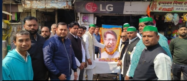 मथुरा आज दिनांक 12 फरवरी 2024 को भारतीय किसान यूनियन अराजनैतिक के कार्यकर्ताओं पदाधिकारी ने महानगर अध्यक्ष पवन चतुर्वेदी के नेतृत्व में किसानों के मसीहा पूर्व केंद्रीय मंत्री चौधरी अजीत सिंह की 85 वी जयंती मथुरा महानगर के हृदय स्थल होली गेट चौराहे पर किसानों के मसीहा के चित्र पर पुष्प अर्पित कर व मिष्ठान वितरण कर धूमधाम से मनायी गयाी कार्यक्रम के मुख्य अतिथि वरिष्ठ किसान नेता दिनेश आनंद पापे जी वरिष्ठ किसान नेता राजवीर सिंह नेताजी छात्र नेता विश्वेंद्र चौधरी थे।