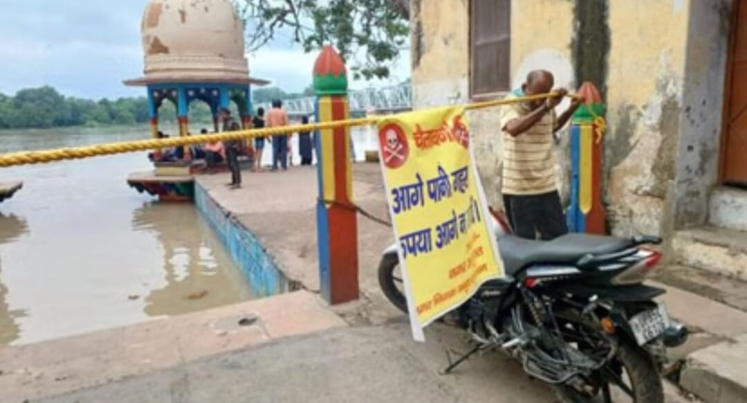 मथुरा। विश्राम घाट मंदिर परिसर जलमग्न हो गया है। घाटों पर पानी भर जाने से हालात चिंताजनक हो गए हैं। खतरे से बचाव के लिए नगर आयुक्त जगप्रवेश ने चेतावनी वाले बोर्ड और रस्सी लगाकर बैरिकेडिंग करवा दी है, ताकि कोई यमुना किनारे न जाए। बावजूद भी लोग चेतावनी वाले बोर्ड को पार करके घाट तक पहुंच रहे हैं। यमुना का रौद्र रूप देखकर बाढ़ की आशंका पर चर्चा कर रहे हैं। यमुना का जलस्तर बढ़ जाने से विश्राम घाट पानी में डूब गया है। इधर, मंदिर परिसर में पानी भर जाने से श्रद्धालुओं को परेशानी हो रही है। वे यमुना के पानी में घुसकर पूजा कर रहे हैं। परिक्रमा मार्ग से सटे श्याम घाट, बंगाली घाट और विश्राम घाट पर रात में और अधिक पानी बढ़ने की आशंका है।