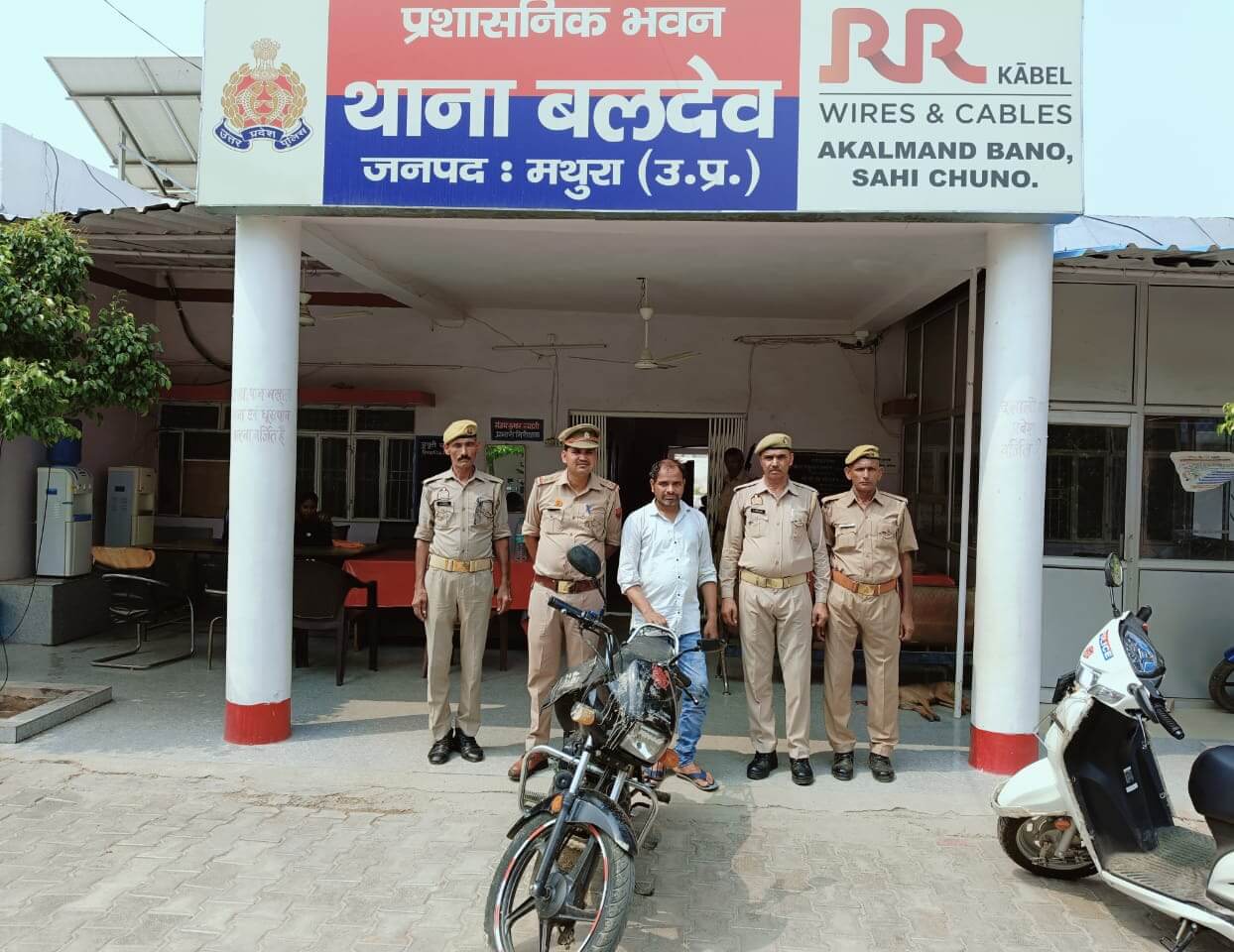 मथुरा। श्रीमान वरिष्ठ पुलिस अधीक्षक, मथुरा* के आदेश के अनुपालन में वाहन चोरी करने वाले तथा वांछित अपराधियों के विरुद्ध चलाये जा रहे अभियान के अन्तर्गत श्रीमान पुलिस अधीक्षक ग्रामीण मथुरा व श्रीमान क्षेत्राधिकारी महावन मथुरा के निकट पर्यवेक्षण व थाना प्रभारी थाना बलदेव के कुशल निर्देशन व नेतृत्व में उ0नि0 आदर्श कुमार सिंह चौकी इंचार्ज हनुमान तिराहा मय हमराह के मुखबिर की सूचना पर मोटर साईकिल चोरी करने वाले एक अभियुक्त दिनेश पुत्र बंगालीमल नि० बोहरे वाला मोहल्ला कस्बा व थाना बल्देव, मथुरा उम करीव 34 वर्ष को चोरी की क मोटर साईकिल के साथ दिनांक 26.06.2024 को समय 07.35 बजे एनएनएस कालेज से 100 कदम पहले की दूरी से गिरफ्तार किया गया । अभियुक्त के विरूद्ध अग्रिम आवश्यक विधिक कार्यवाही की जा रही है।