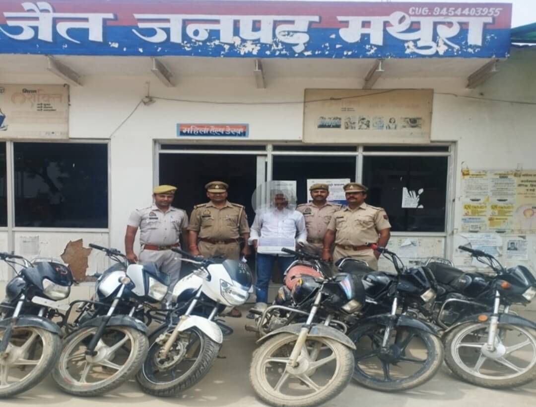 मथुरा। थाना जैत पुलिस दने एक अभियुक्त को चोरी की 06 मोटरसाइकिल, एक अवैध तमन्चा व दो कारतूस सहित गिरफ्तार किया है।वरिष्ठ पुलिस अधीक्षक मथुरा महोदय द्वारा अपराध एवं अपराधियों के विरुद्ध चलाये जा रहे चोरी और लूट से सम्बन्धित अभियुक्तगणों की गिरफ्तारी व चोरी और लूट से सम्बन्धित संपत्ति की बरामदगी अभियान के क्रम में *श्रीमान पुलिस अधीक्षक नगर महोदय* के निर्देशन में *श्रीमान सहायक पुलिस अधीक्षक/क्षेत्राधिकारी सदर महोदय* के निकट पर्यवेक्षण में प्रभारी निरीक्षक थाना जैत जनपद मथुरा के कुशल नेतृत्व में पुलिस टीम थाना जैंत मथुरा द्वारा मुखबिर खास की सूचना पर चैकिंग के दौरान अभियुक्त मौसम पुत्र दल्ली निवासी रुन्ध थाना खौह जिला भरतपुर राजस्थान उम्र करीब 23 वर्ष को दिनाँक 03.08.2024 समय 2.10 बजे बढौता चौमुंहा रोड के0आर ग्रुप के पास से गिरफ्तार किया गया । अभियुक्त मौसम उपरोक्त से कब्जे व निशादेही के आधार पर चोरी की 6 मो0सा0 1. मो0सा0 एचएफ डिलक्स रंग काला चैसिस नम्बर MBLHAW125PGF11063 व इंजन नम्बर HA11E1PGF00505 UP85CJ3601 2. स्पलैन्डर प्लस मोटरसाइकिल रंग काला चैसिस नम्बर MBLHAW087K4D07057 तथा इंजन नम्बर HA10AGK4D13692 RJ11SM7647 3. स्पलैन्डर प्लस रंग काला जिसके आगे नम्बर प्लेट UP85AX6279 लगी हुयी तथा चैसिस नम्बर MBLHA10AMEHD14209 तथा इंजन नम्बर HA10EJEHD35952 ,4. मोटरसाइकिल स्पलैन्डर प्लस रंग काला सिल्वर चैसिस नम्बर  MBLHAW128L4L07 ,HA11EYL4L05471 ,5. मोटरसाइकिल हीरो स्पलैन्डर आई स्मार्ट रंग काला सिल्वर, चैसिस नम्बर  MBLHA12ACHM15125 तथा इंजन नम्बर HA12EMFHM15419  रजिस्ट्रेशन नम्बर RJ11SH4073 6. मोटरसाइकिल अपाचे रंग सफेद आगे पीछे कोई नम्बर प्लेट नही लगी है चैसिस नम्बर MB634KE62F2K55362 इंजन नम्बर OE6KF2162329 , नम्बर UP75X2553  व  एक अवैध तमंचा .315 बोर व दो जिन्दा कारतूस .315 बोर बरामद  हुए ।  अभियुक्त मौसम उपरोक्त से गिरफ्तारी व बरामदगी के आधार पर थाना जैंत पर मु0अ0स0 351/2024 धारा 35(1)(2)/106 बी0एन0एस0एस0 व 318(4)/317(2)/317(4) बीएनएस व 3/25 आयुध अधिनियम पंजीकृत कर विधिक कार्यवाही की गयी ।