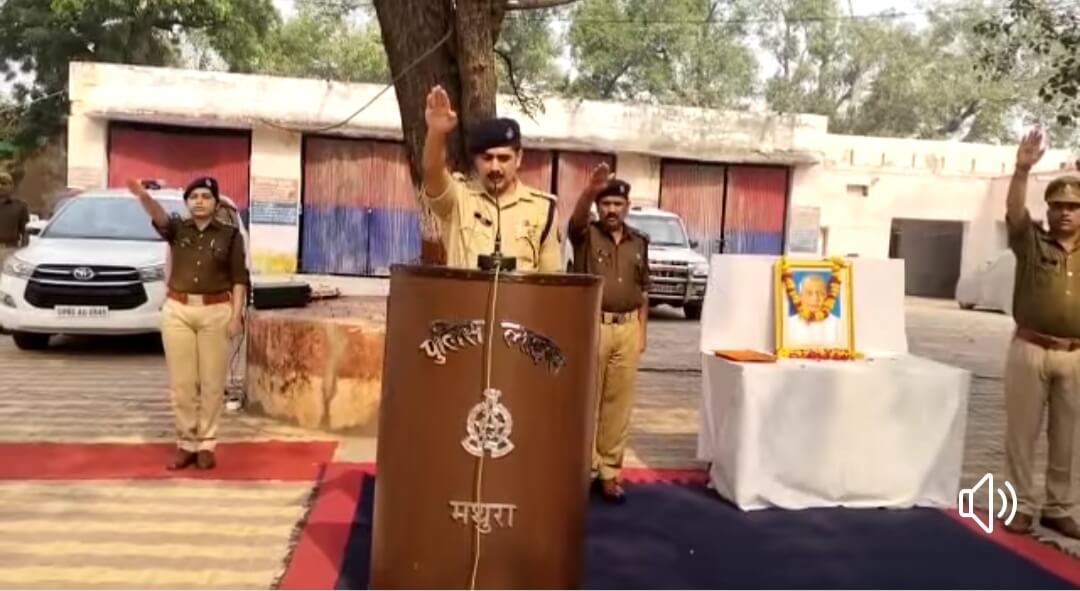 मथुरा। आज दि0 31.10.2022 को “राष्ट्रीय एकता दिवस” के अवसर पर श्रीमान वरिष्ठ पुलिस अधीक्षक, मथुरा द्वारा पुलिस लाइन परिसर में लौह पुरूष सरदार वल्लभ भाई पटेल की जयंती पर उनकी प्रतिमा चित्र पर माल्यार्पण कर उन्हे नमन किया गया तथा सभी पुलिस अधिकारी/कर्मचारीगण को उनके आदर्शों पर चलने एवं देश की एकता और अखंडता को बनाए रखने की शपथ दिलाई गयी ।