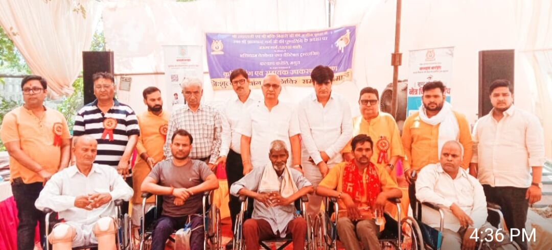 मथुरा। वृन्दावन में रुक्मणि विहार, सैक्टर-1 स्थित भक्ति धाम में प्रमुख समाज सेवी स्वर्गीय ज्ञान चंद्र गर्ग (पटियाला,पंजाब) की नौवीं पुण्यतिथि के उपलक्ष्य में भक्ति धाम वैलफेयर एंड चैरिटेबल ट्रस्ट(रजि.) एवं कल्याणम् करोति, मथुरा के संयुक्त तत्वावधान में दिव्यांग सहायता शिविर का आयोजन पीपाद्वाराचार्य जगद्गुरु बाबा बलरामदास देवाचार्य महाराज की पावन अध्यक्षता में सम्पन्न हुआ।जिसमें लगभग 35 से भी अधिक दिव्यांग व्यक्तियों को नि:शुल्क व्हील चेयर, वैशाखी, कृत्रिम अंग व उपकरण आदि का वितरण मुख्य अतिथि मथुरा-वृन्दावन नगर निगम के महापौर विनोद अग्रवाल, उप-सभापति मुकेश सारस्वत, भक्ति धाम वैलफेयर एंड चैरिटेबल ट्रस्ट(रजि.) के अध्यक्ष के. एल. बंसल, समाजसेवी अरुण गर्ग (पातड़ा वाले) एवं डॉ. गोपाल चतुर्वेदी आदि के द्वारा किया गया।