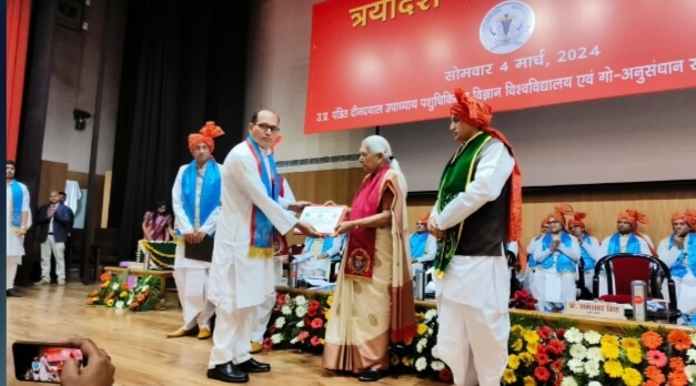 मथुरा 04 मार्च। उत्तर प्रदेश पंडित दीनदयाल उपाध्याय पशु चिकित्सा विज्ञान विश्वविद्यालय एवं गौ-अनुसंधान संस्थान का 13वां दीक्षांत समारोह महामहिम राज्यपाल श्रीमती आनंदीबेन पटेल जी की अध्यक्षता में संपन्न हुआ। महामहिम राज्यपाल जी ने कार्यकम का शुभारम्भ जलभरो अनुष्ठान के साथ प्रारम्भ किया। कार्यक्रम में महामहिम राज्यपाल जी ने Bovine Myology: A colour atlas तथा Veterinary Andrology and Artificial Insemination: Concepts and Application शीर्षक नामक पुस्तकों का विमोचन किया। उन्होंने पशुपालकों के उपयोग हेतु पशुओं को होने वाली सामान्य व्याधियों के पारम्परिक व घरेलु नुस्खों से उपचार के सात वैज्ञानिक लघु प्रकाशनों का विमोचन किया। छात्र दिग्दर्शिका के दूसरे संस्करण का विमोचन किया। पशुओं की बातें प्रसारण का शुभारम्भ, विश्वविद्यालय संवादपत्र खण्ड 19 सं 02 तथा विश्वविद्यालय पशुधन पत्रिका खण्ड 17 का विमोचन किया।