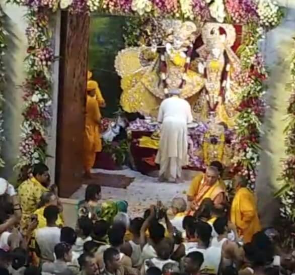 मथुरा में आनंद और उल्लास में डूबे भक्त, भूख प्यास को भूलकर आराध्य के जन्म की प्रतीक्षा में सोमवार मध्यरात्रि घड़ी की टिक-टिक करती सुइयों को व्याकुलता से निहार रहे थे। रात्रि 12 बजे घड़ी की दोनों सुइयों का संगम होते ही भाद्रपद की कृष्ण पक्ष की अष्टमी पर ब्रज में कान्हा के जन्म का उद्घोष हो गया। नटवर नागर के जन्मोत्सव के लाखों श्रद्धालु साक्षी बने। अजन्मे के जन्म पर मंत्रोच्चारण के बीच शंखनाद हुआ, तो मानो ब्रज की लता-पता भी झूम उठीं। देवकीनंदन के जन्मोत्सव पर मानो ब्रज का कण-कण धन्य हो गया। गोकुल सहित पूरे ब्रज के मंदिरों में प्रगट भये गोपाला… और बधाई गीतों से माहौल भक्तिमय हो गया। श्रीकृष्ण के जन्मस्थान पर माहौल कुछ इस प्रकार था कि घड़ी की सुई ने 11 बजने का इशारा किया तो श्री गणेश, नवगृह स्थापना के साथ पूजन शुरू हुआ। 11.55 बजे तक कमल पुष्प एवं तुलसीदल से व सहस्त्रार्चन हुआ। अब 12 बजने में में बस पांच मिनट बाकी थे। हर श्रद्धालु लल्ला के आगमन को लेकर आतुर था। 11.59 बजते ही प्राकट्य दर्शन के लिए युगल सरकार के पट बंद हो गए। इस एक मिनट के पल में श्रद्धालुओं को लगा मानो घंटों बीत रहे हों। ठीक 12 बजे लीलाधर के चलित श्रीविग्रह को भागवत भवन लाया गया। यहां रजत कमल पुष्प में विराजमान भगवान श्रीकृष्ण का श्रीराम जन्मभूमि तीर्थ क्षेत्र के अध्यक्ष महंत नृत्य गोपालदास महाराज, श्रीकृष्ण जन्मस्थान के ट्रस्टी अनुराग डालमिया, सचिव कपिल शर्मा और सदस्य गोपेश्वर नाथ चतुर्वेदी ने सोने-चांदी से निर्मित 100 किग्रा की कामधेनु गाय की प्रतिमा में गंगाजल सहित पंचामृत भरकर लल्ला का अभिषेक किया। श्रीकृष्ण जन्मोत्सव की इस अद्भुत घड़ी पर भक्तों में उल्लास छा गया। श्रीकृष्ण जन्मस्थान पर ढोल-नगाड़े और घंटे-घड़ियाल गूंज उठे। झांझ-मजीरे, मृदंग और शंख की मंगलध्वनि के बीच कान्हा के बधाई गीत गुंजायमान हो उठे। दर्शन का दौर 1:30 बजे तक चलता रहा।
