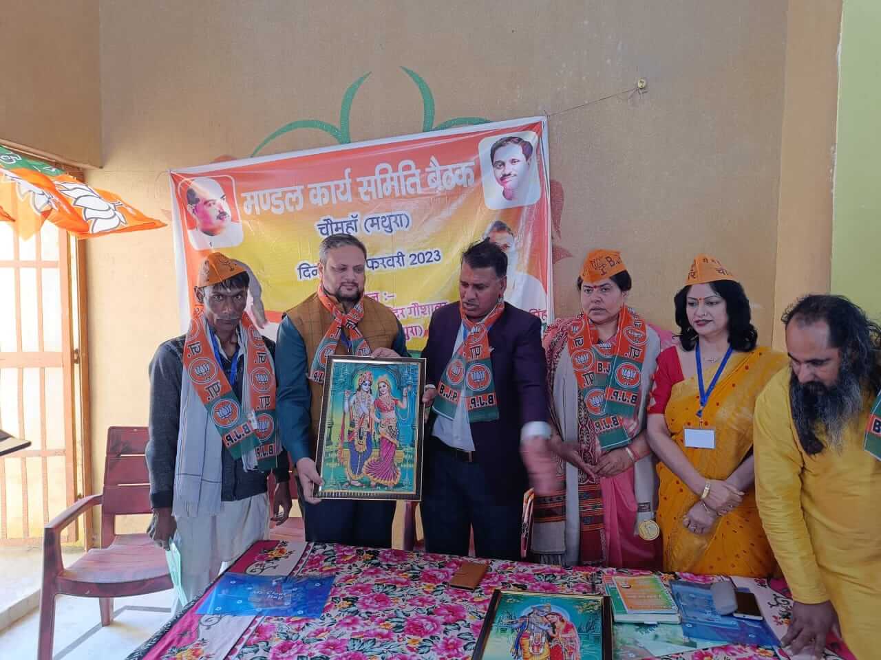मथुरा। भारतीय जनता पार्टी की मंडल चौमुहा कार्यसमिति की बैठक ग्राम अकबरपुर श्री गोपाल मंदिर अनाथ गौशाला पर कुशल संपन्न हुई जिसमें अलग-अलग पार्टी के जिले से पधारे मुख्य वक्ताओं द्वारा कार्यकर्ताओं को जिला अध्यक्ष मधु शर्मा ने संबोधित किया मधु शर्मा के कुशल नेतृत्व में छाप आगामी निकाय चुनाव परिश्रम करने की अपील की कार्यक्रम में सभी भाजपा कार्यकर्ताओं मंडल अध्यक्ष डॉ राजवीर सिंह ने धन्यवाद दिया मंडल प्रभारी इंजीनियर कल्पना गर्ग देव ऋषि सोशल मीडिया संयोजक आदित्य पांडे ब्लाक प्रमुख शोभाराम समाजसेवी पूरन सिंह सिसोदिया महामंत्री मुरारी लाल महामंत्री राजवीर सिंह मंडल मंत्री श्री हरि गोपाल शास्त्री मूलचंद प्रधान करौली ओमप्रकाश प्रधान दिनेश बाबा मदन मोहन दास और अन्य कार्यकर्ता भारी संख्या में मौजूद रहे।