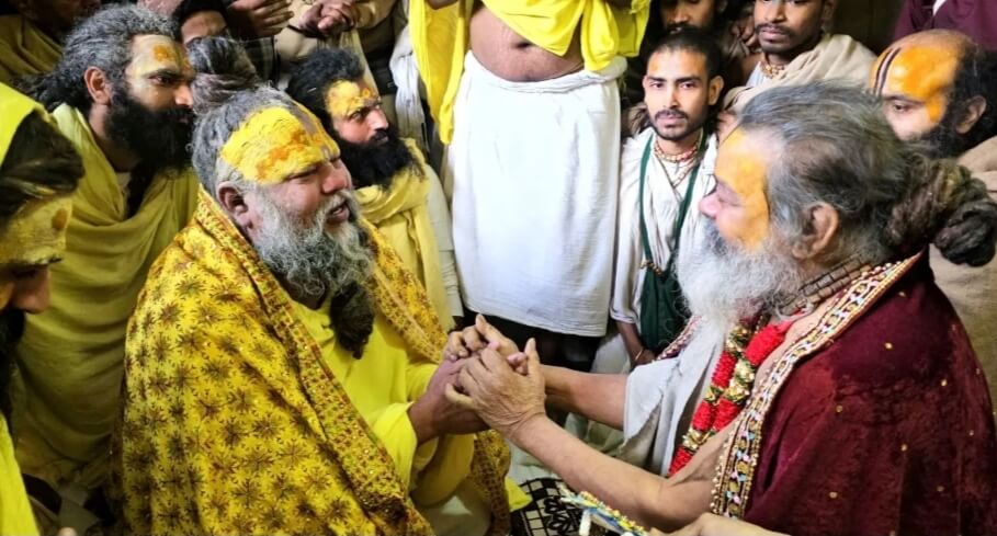 मथुरा। बरसाना में आंखों में आंसुओं की धारा बस जुबां पर राधा राधा नाम जपते हुए संत प्रेमानंद महाराज ब्रज के विरक्त संत विनोद बाबा से जब मिले तो संत विनोद बाबा भी उन्हें देखकर रोने लगे। दो संतों के इस अद्भुत मिलन को देखकर श्रद्धालु भी भाव विभोर हो गए। करीब एक घंटे तक संत प्रेमानंद महाराज व संत विनोद बाबा के मध्य अध्यात्म को लेकर चर्चा हुई। गुरुवार को ब्रज के विरक्त संत विनोद बाबा सुबह नौ बजे अपने प्रिया कुंज आश्रम पर नित्य की भांति राधा नाम के भजन में मंत्रमुग्ध थे तभी अचानक प्रेमानंद महाराज उनके दर्शन करने उनके आश्रम पर पधारे। संत विनोद बाबा को देख प्रेमानंद महाराज भाव के आंसू रोने लगे तो विनोद बाबा भी उन्हें देखकर रोने लगे। दोनों संतों के अदभुत मिलन को देख श्रद्धालु भाव विभोर हो गए। करीब दस मिनट तक जमीन में बैठकर दोनों संतों एक दूसरे को निहारते रहे। जिसके बाद संत विनोद बाबा ने प्रेमानंद महाराज के माथे पर चंदन का लेपन कर उनकी आरती उतारी तथा राधारानी परसादी चुनरी उड़ाई। वहीं प्रेमानंद महाराज ने भी विनोद बाबा की आरती उतारी। करीब एक घंटे तक संत प्रेमानंद महाराज प्रिया कुंज आश्रम पर रुके। संत प्रेमानंद महाराज के बारे बोलते हुए विनोद बाबा ने कहा कि आज आप पूरे विश्व में राधा नाम का प्रचार प्रसार कर रहे हो। राधारानी की असीम कृपा हमेशा पर है। संत प्रेमानंद महाराज ने विनोद बाबा से कहा कि वो जल्द दुबारा अपने सभी शिष्यों के साथ उनके आश्रम पर आएंगे। वहीं उनके साथ बैठकर प्रसाद भी ग्रहण करेंगे। वहीं संत प्रेमानंद महाराज के दर्शनों को सैकड़ों की संख्या में भक्त प्रिया कुंज आश्रम में उमड़ पड़े।