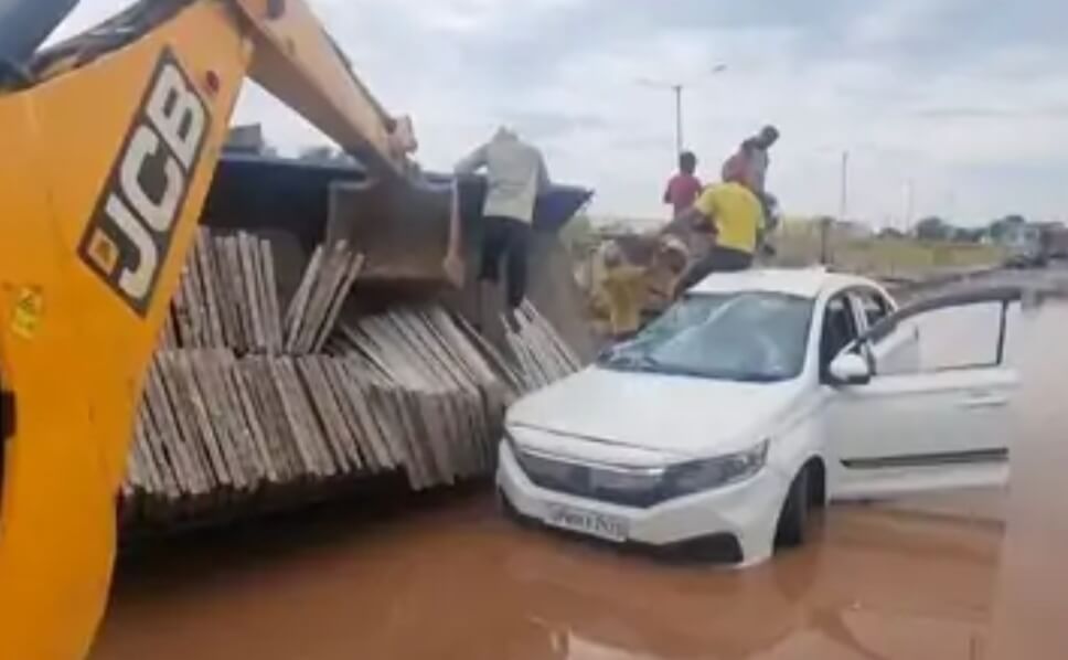 मथुरा में कार पर गिरी ट्रॉली, ड्राइवर घायल; गड्ढे में फंसने से हुआ हादसा