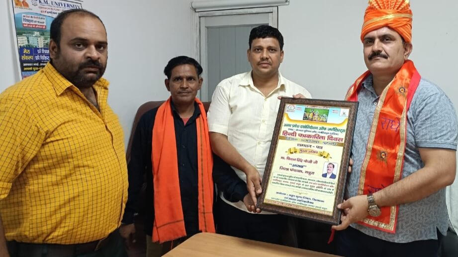 मथुरा| उत्तर प्रदेश एसोसिएशन ऑफ जर्नलिस्ट के जिलाध्यक्ष अतुल कुमार जिंदल एवम टीम ने हिन्दी पत्रकारिता दिवस के उपलक्ष्य में किशन सिंह चौधरी कुलाधिपति के.एम. यूनिवर्सिटी एवम जिला पंचायत अध्यक्ष मथुरा के बतौर राष्ट्र हित,सामाजिक,मानवता के लिए कार्य करने को लेकर प्रशस्ति पत्र देकर सम्मानित किया|