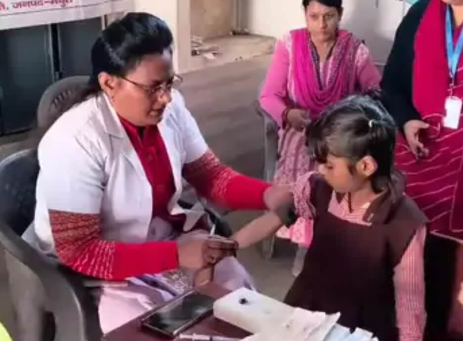 गोवर्धन प्राथमिक विद्यालय में बच्चों का टीकाकरण:मुख्य चिकित्सा अधिकारी ने स्वास्थ्य व्यवस्थाएं जांचीं