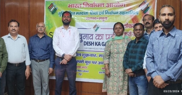 मथुरा 23 मार्च/ भारत निर्वाचन आयोग के निर्देशानुसार लोकसभा सामान्य निर्वाचन 2024 में मतदान हेतु मतदाताओं को जागरूक किया जा रहा है। इसी क्रम में मुख्य विकास अधिकारी / स्वीप नोडल अधिकारी मनीष मीना के द्वारा मतदाता गीत का विमोचन किया गया। इस गीत की रचनाकार हैं स्वीप कोऑर्डिनेटर प्रो0 पल्लवी सिंह और धर्मेंद्र कुमार गोयन। इस गीत को लयबद्ध किया है और स्वर दिया है।