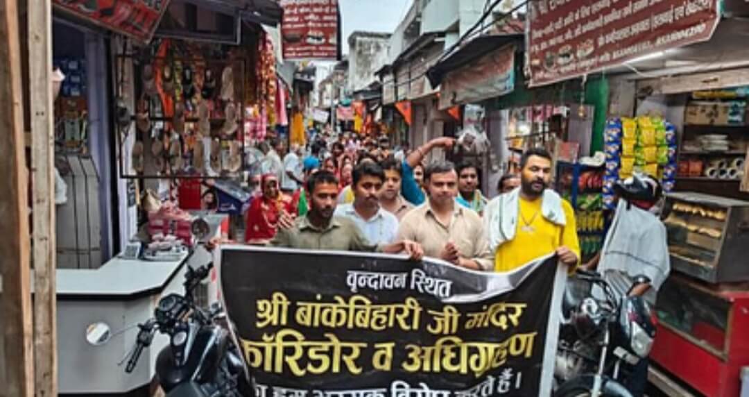 दाऊजी मंदिर के सेवायतों व गोस्वामी परिवार की महिलाओं ने नगर परिक्रमा करते हुए बिहारीजी मंदिर कॉरिडोर व न्यास बनाये जाने का विरोध किया। श्री सेवायतों ने इस कृत्य को सनातन विरोधी बताया। बलदेव पांडेय, पुष्पेंद्र पांडेय ने कहा सरकार का यह सनातन विरोधी कार्य है। हम सभी मंदिरों की रक्षा करेंगे। मंदिर की पूजा सेवा व चढ़ावे पर सरकार का कोई हस्तक्षेप नहीं होना चाहिए। सांसद के बयान की निंदा की गई। प्रदीप पांडेय, चीनू पांडेय ने कहा सरकार की निगाह मंदिरों पर लगीं हैं। कॉरिडोर पर सरकार पुनर्विचार करे। इस दौरान अनिल पांडेय, भगवत पांडेय, विष्णु पांडेय, सोनू पांडेय, जतिन पांडेय, मनु पांडेय, राहुल पांडेय, सत्यदेव पांडेय, पिंटू पांडेय, रेवतीरमन पांडेय आदि मौजूद रहे।