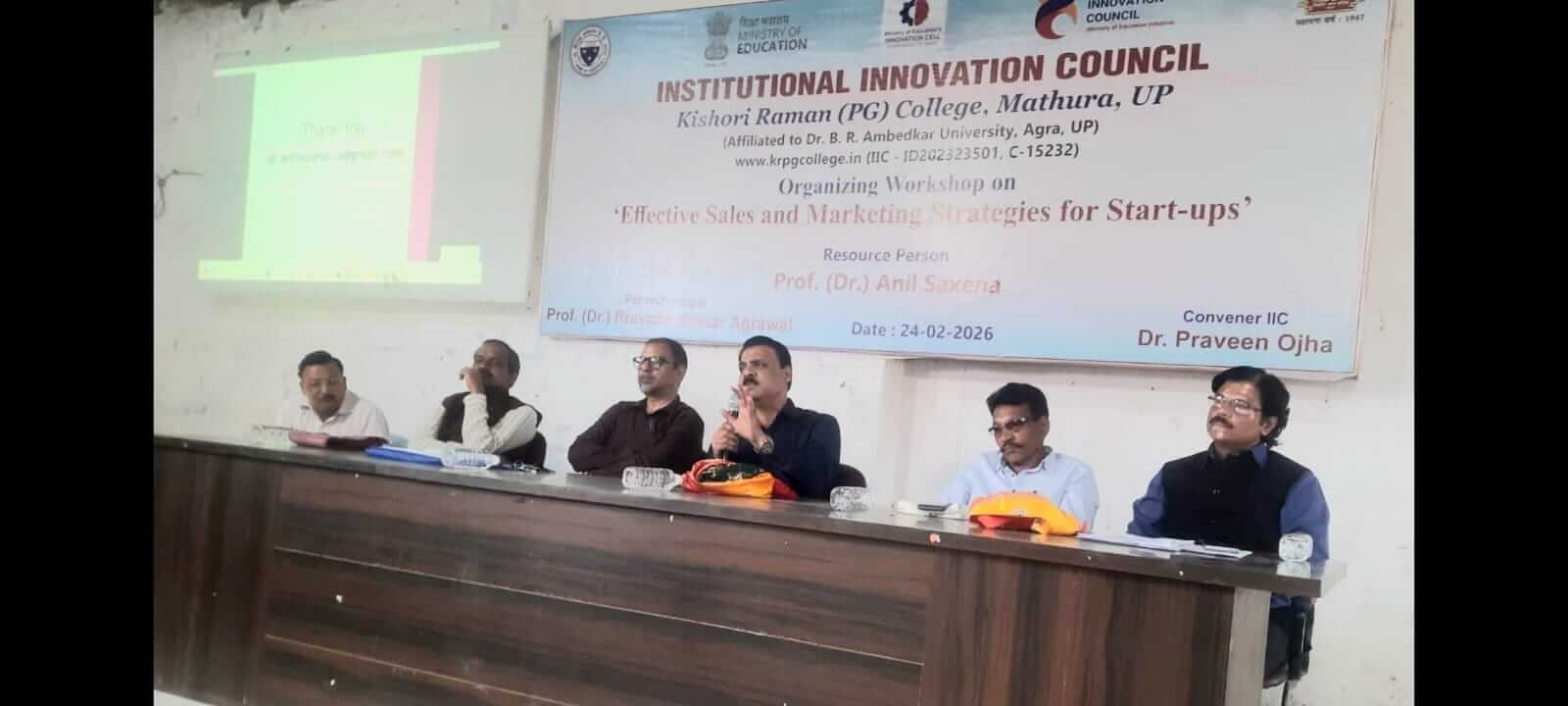 रिपोर्ट मोहित सिंघल मथुरा दिनांक 24 फरवरी, 2026 को किशोरी रमण काॅलेज की इंंस्ट्यूशनल इनोवेशन कौंसिल द्वारा “प्रभावी बिक्री और विपणन रणनीतियां” बिषय पर वर्कशॉप का आयोजन किया गया। इस वर्कशॉप का शुभारंभ प्रो. विनोद खंडेलवाल द्वारा सरस्वती वंदना के माध्यम से कराया गया। इनोवेशन काउंसिल के संयोजक डॉ. प्रवीण ओझा ने इस वर्कशाप के उद्देश्यों से सभी विद्यार्थियों और श्रोताओं को अवगत कराया। इस वर्कशॉप की अध्यक्षता करते हुए प्राचार्य प्रो.प्रवीण कुमार अग्रवाल ने विद्यार्थियों को संबोधित करते हुए स्टार्टस अप की संभावनाओं के विषय में विस्तार से विद्यार्थियों को अवगत कराया और उन्हें प्रोत्साहित करते हुए कहा कि वह स्वरोजगार के माध्यम से राष्ट्र निर्माण में अपनी भूमिका निर्धारित करें । इस वर्कशॉप में मुख्य वक्ता के रूप में चार्टर्ड एकाउंटेंट प्रो. अनिल सक्सेना जी ने पी.पी.टी. के माध्यम से विद्यार्थियों को प्रभावी बिक्री और प्रभावी विपणन रणनीतियों के बारे में महत्वपूर्ण जानकारी प्रदान, उन्होंने विद्यार्थियों को नवाचार की ओर बढ़ने के लिए प्रोत्साहित किया और अनेक उदाहरणों के माध्यम से उन्होंने नवीन स्टार्टअप्स प्रारंभ करने और उससे पहले रणनीतियां तय करने तथा तथा सकारात्मक और नकारात्मक दोनों ही पहलुओं पर विचार करने की सलाह विद्यार्थियों को दी। उन्होंने अनेक संभावनाओं के बारे में विस्तार से विद्यार्थियों को जानकारियां प्रदान की। विद्यार्थियों ने बड़ी गंभीरता से उनके द्वारा दी गई सलाह और जानकारी के प्रति रुचि दिखाई तथा अनेक जिज्ञासाओं का समाधान भी उन्होंने प्रोफेसर सक्सेना के माध्यम से किया।