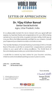 आगरा। 8 नवंबर 2022, लंदन के बैरिस्टर अध्यक्ष एवं सीईओ संतोष शुक्ला ने आगरा के सुप्रसिद्ध समाजसेवी डॉ. विजय किशोर बंसल को सम्मान-पत्र के माध्यम से उनके समाज के प्रति उदारता, समाजसेवा, सांस्कृतिक संवर्धन, समाज में समाजिक समता- समरसता कायम रखने पर एवं मानवीय संवेदनाओं की प्रसंशा करते हुए वर्ल्ड बुक ऑफ रिकॉर्ड्स की केन्द्रीय कार्य समिति (सीडब्ल्यूसी) के सदस्यों के साथ डॉ बंसल के कार्यों को सराहना करते हुए उज्जवल भविष्य की कामना की है ।
